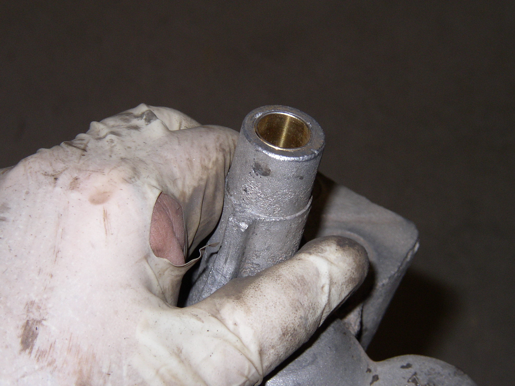 Second, hook up my homemade drill driver tool and see if all five gears are present, check. Note reverse gearshift pattern written on cardboard to help me figure out where I am. OK, the trans might be OK, proceed with putting new shift bushings in the nosecone. Most people would buy a new $40-60 nose, but not me.