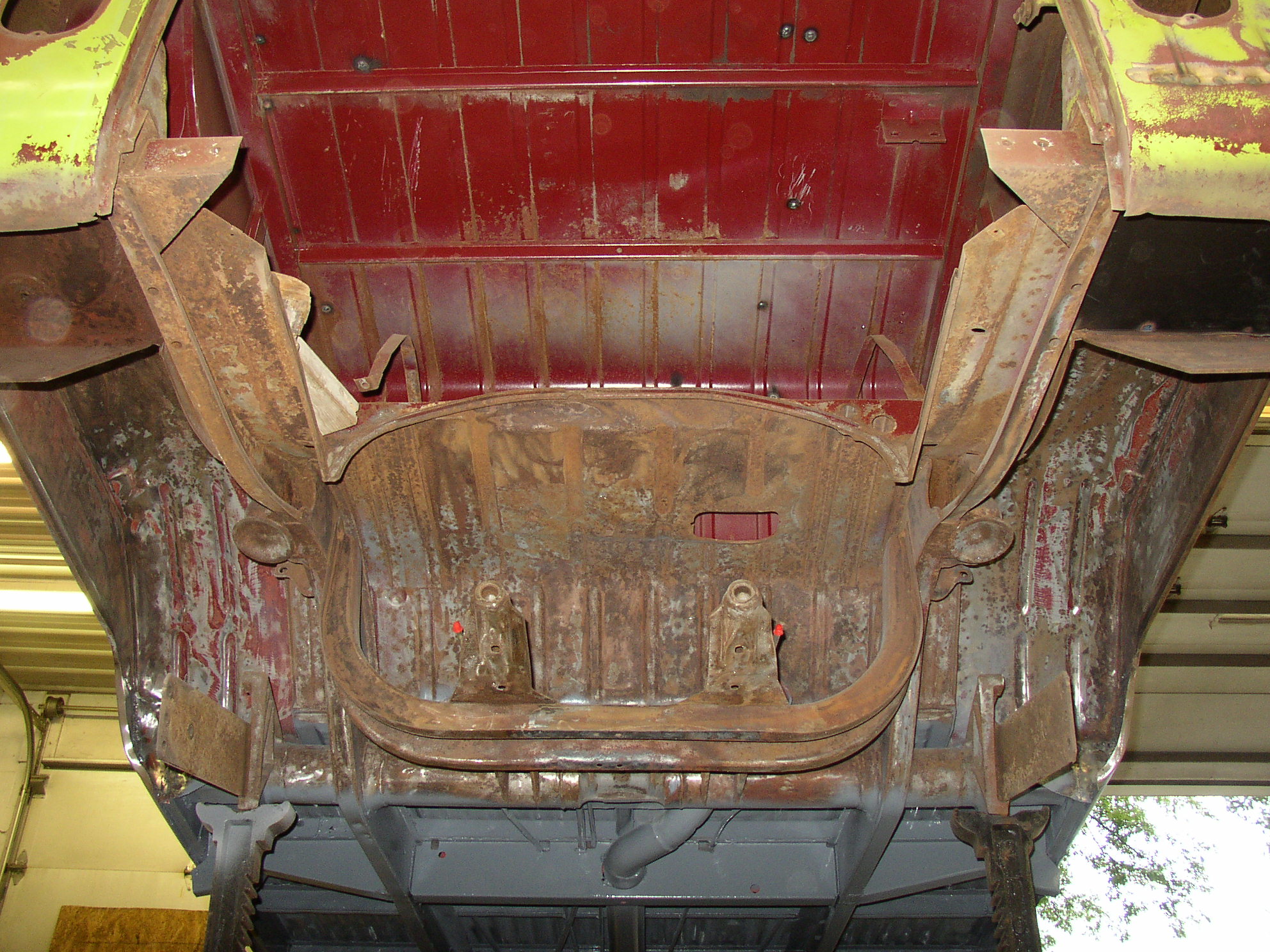 I finished fiberglassing the bottom of the floorpan seams, cleaning, grinding and blasting the center section and shot it. (I had already done the front third, now this is the center third) What a f'ing PITA that is to shoot paint upside down! I had to use my crappiest HF gun with a bottom siphon cup. All of my better guns are top feed which you can't use painting the bottom of a vehicle because the cup is in the way.