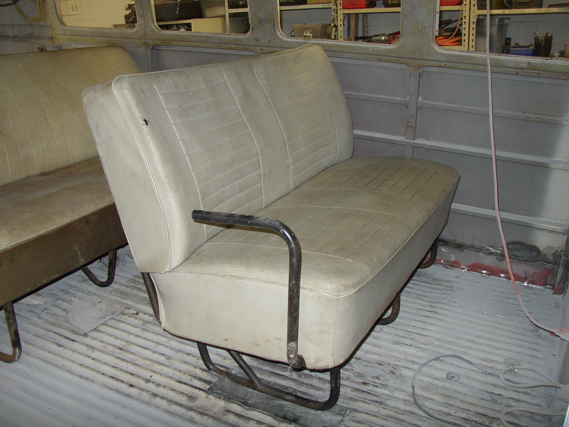 I removed the Bondo from the dent in the middle and worked it out from the inside, it came out quite well and will only need a skim coat instead of the 3/4" it had. I stripped the paint to find many coats, this was a '67 Deluxe door- it looks like the original bus was yellow bottom, white top, and repainted blue, but there's no factory yellow color in splitties, so I guess it changed color at least twice in its life. There might be 7 layers if you count primer- 2 blues, yellow, and white.