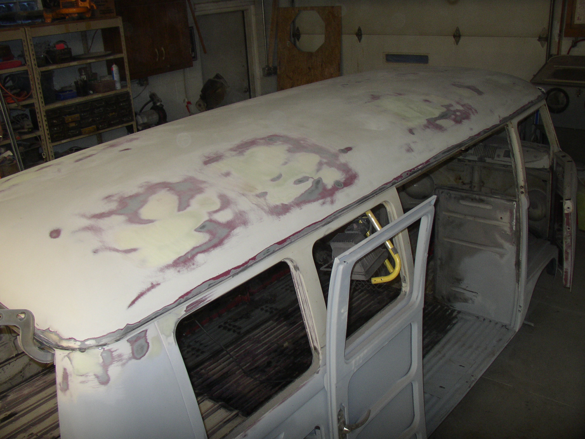 Worked a long day today and got a shitload done- dropped it down and started on the roof- DA'd the whole roof, wire wheeled the rain gutters, unwrinkled some wrinkles in the roof, and a few skim coats of mud. Also wirewheeled the side window openings. My f'ing arms hurt right now from handling that grinder (WW) for so long. That thing is a fighter......