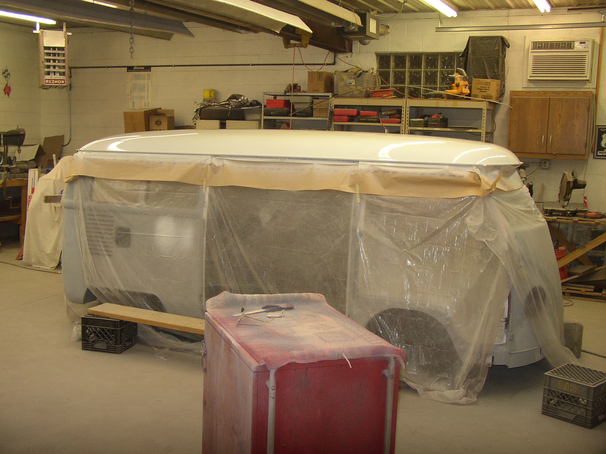 Finally got some time dedicated to the bus and got a lot done but not without a big hitch. Monday I finished prepping the interior with dabs of mud, weld and etc to fix all of those little things that show up in primer. I masked the bus and left the heat on warm all night so I could shoot yesterday on warm metal. I went in early (10 is early for me) looking forward to shooting the PPG DelFleet paint I bought a couple of months ago. I usually use the cheap stuff (Kirker) which I've had good luck with for decades but this time I was talked into the good stuff by a local authority (to be named later). I read the instruction sheet again and mixed the paint using a digital scale to exact gram measurements. The surface temp was 75ish with an IR gun when I started and shit went wrong from there in a big way. I was having no luck at all with this paint- thin, ran, wouldn't cover, wouldn't set up, I meant this shit was bad. It was like shooting milk from a spray gun. I called Chuck with a 'WTF am I doing wrong' tone of voice, he came right out and arrived at the conclusion I got a bad can of paint. Luckily I had 1.5 gallons of white Kirker in the cabinet, so I switched to that and had much better luck. All in all, a good day in the long run.