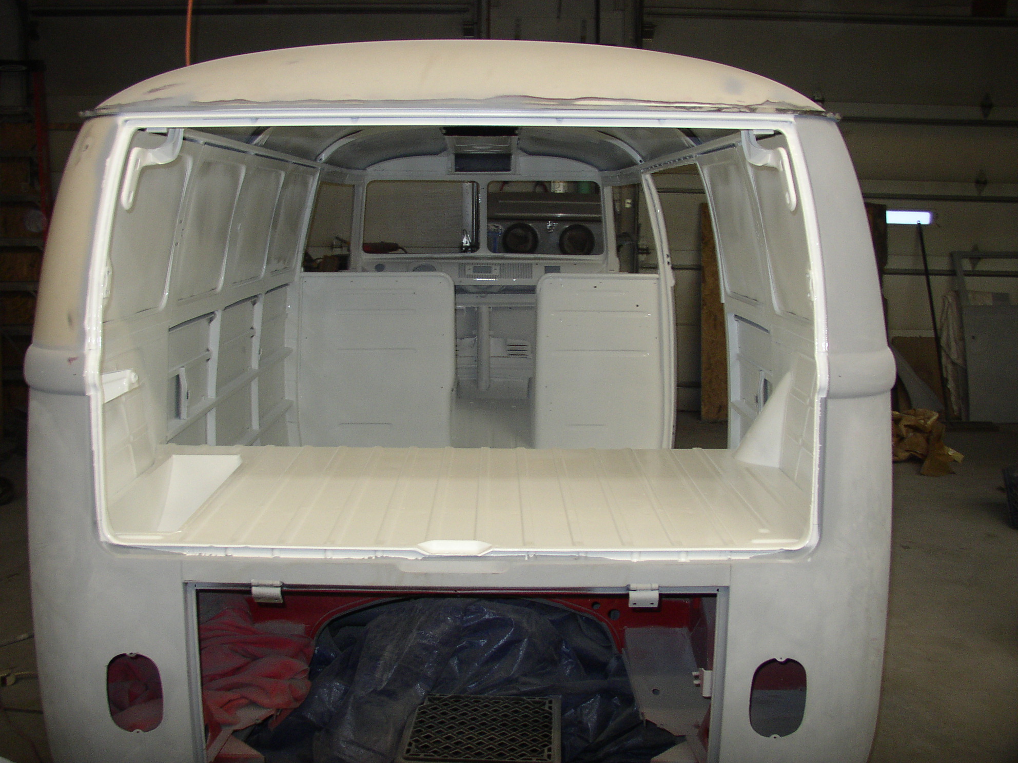 3+ weeks ago I was at 505 hours but I've been working out of town every week since. I have snuck a few days in so my hours are probably at 530 right now with still not a lot to show for it. I have the complete interior primed but that shows up all those pesky little things that still need a dab of mud or TLC, so that's where my time has been spent. The dash (radio repair plate) is mudded, sanded, and ready for color. I made some heat deflectors so the overhead furnace radiant tubes in the shop don't roast the top of the bus so badly. I visited Bill and believe my colors and upholstery are picked out and will get those ordered soon (tomorrow). Christmas activities are also crowding my shop time, I wanted to get out there today but didn't make it. I still need to make a present for my wife and still have travel for work to get in. I doubt color will be going on this month but it's certainly not back burner.
