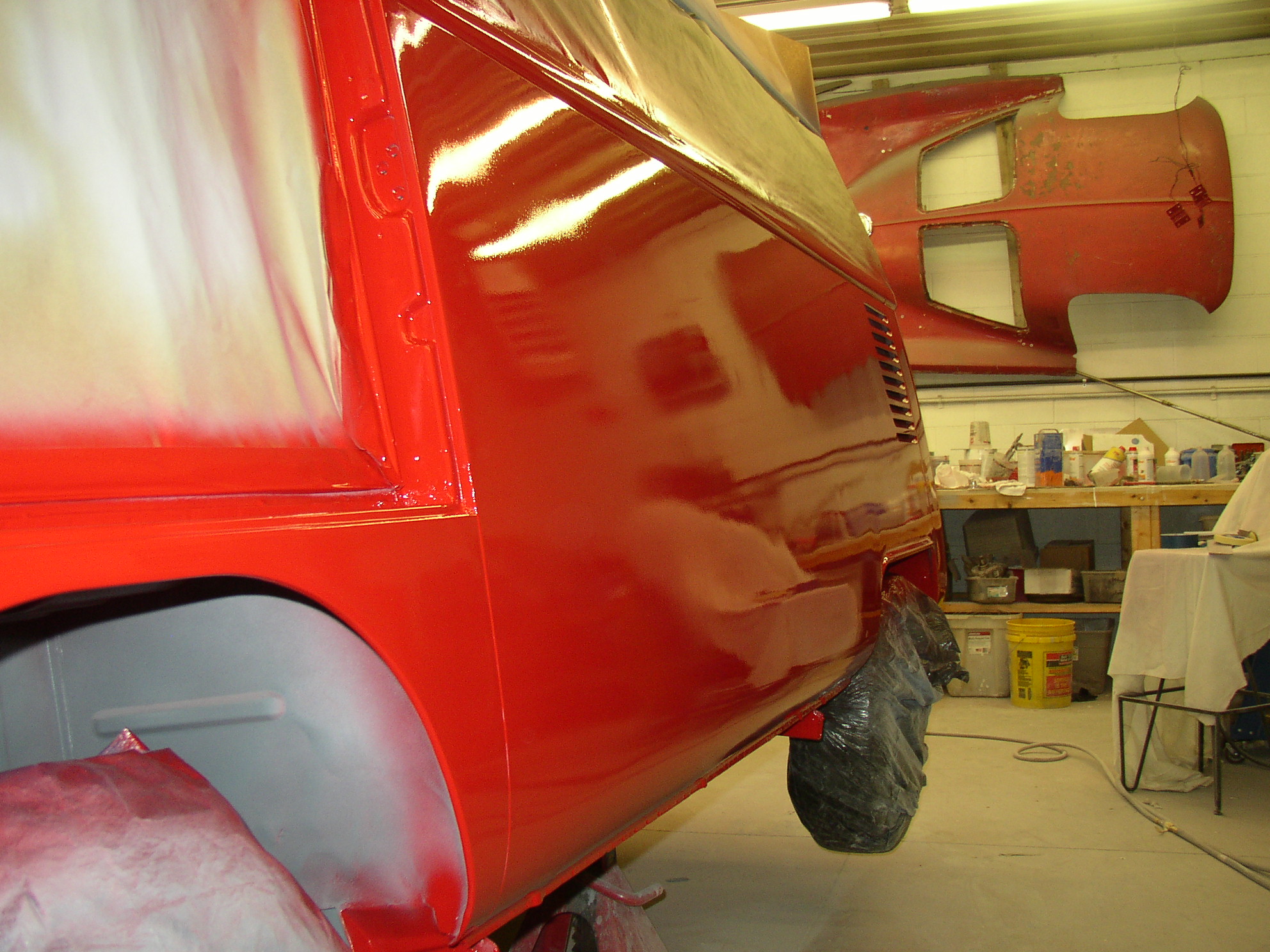Still some reshoot to do- the rear decklid was wavy and I don't think I could live with it. Even after 600 grit and wetsanding it didn't meet my standards so it's back in primer right now. I was working on stupid shit today like the dash tray, miscellaneous brackets and etc. that need to be painted to get the steering box in. I cobbled up a BS spray booth for parts- a big cart with tarps over it ducted to the exhaust fan so I can paint inside without getting overspray on my pretty bus. HeyEd and Mike Roecker stopped by lately to check QC.
