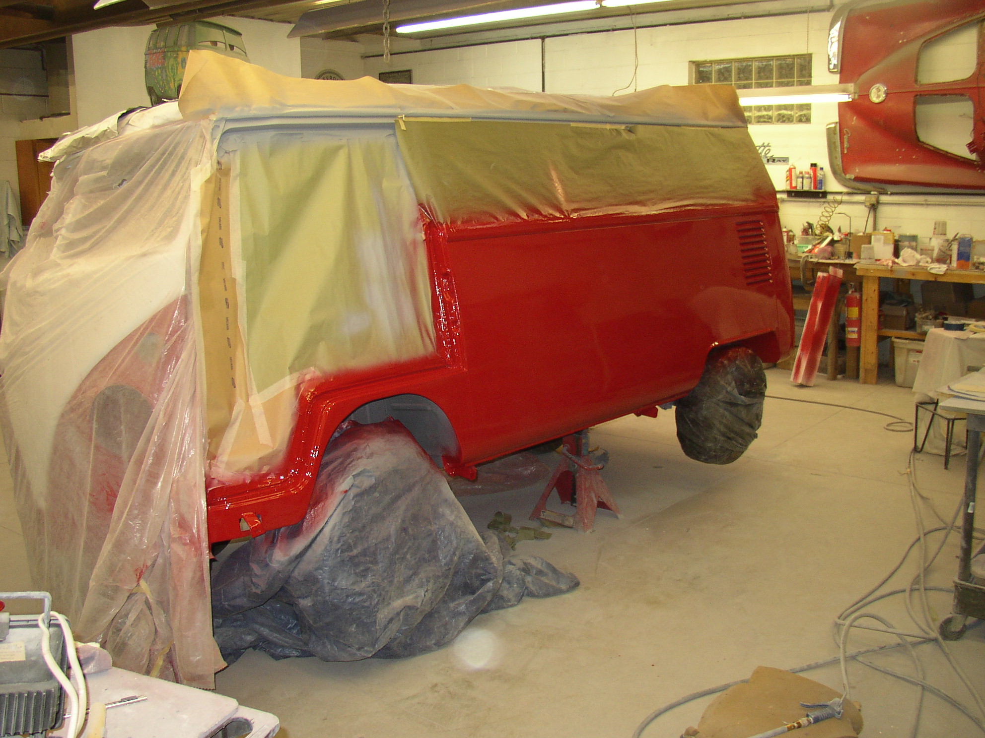Still some reshoot to do- the rear decklid was wavy and I don't think I could live with it. Even after 600 grit and wetsanding it didn't meet my standards so it's back in primer right now. I was working on stupid shit today like the dash tray, miscellaneous brackets and etc. that need to be painted to get the steering box in. I cobbled up a BS spray booth for parts- a big cart with tarps over it ducted to the exhaust fan so I can paint inside without getting overspray on my pretty bus. HeyEd and Mike Roecker stopped by lately to check QC.