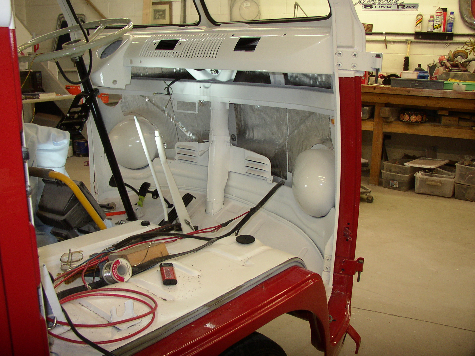 I made a lot of progress this week even though I was out of town a couple of days. I installed the clutch cable, modified the Bowden tube slightly, throwout brng, starter, harness, etc. I put a 40amp Maxifuse in the power feed that heads up front to prevent shorts from burning the bus down. I suggest everyone consider this. I can't believe VW never put circuit protection in millions of cars, they'd all be recalled if they did that today. I don't know of any current mfr that doesn't use a fuse or fusible link in their main power feed. VW doesn't fuse the front parking lights, either, a short up there melts the wires.