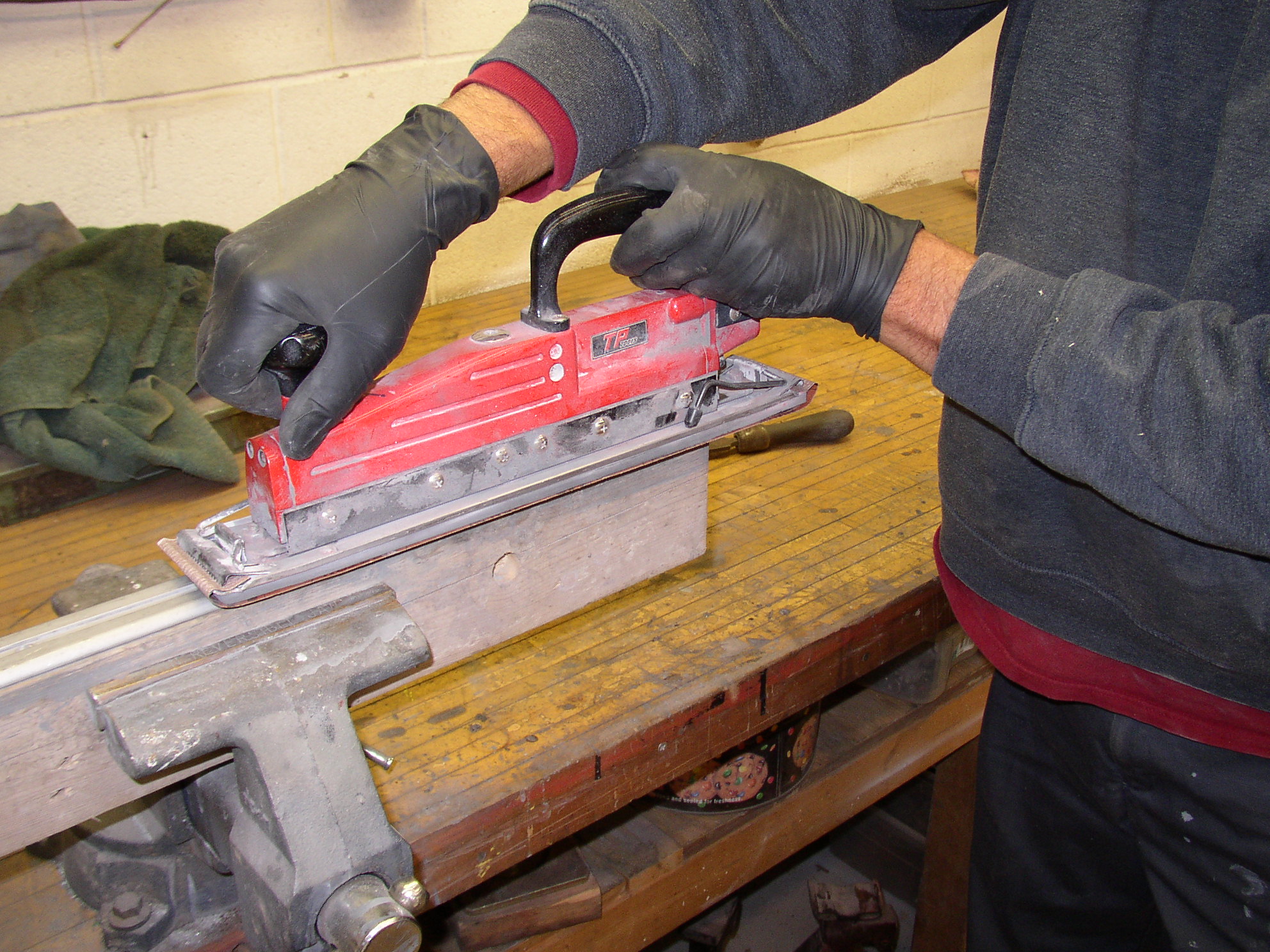 Then put a 2x4 in the vise and screw the piece to it with drywall screws. Be gentle, snug is fine, if you tighten the screw it will bend or kink the trim. Now take a file and smooth out any ripples or high spots.
