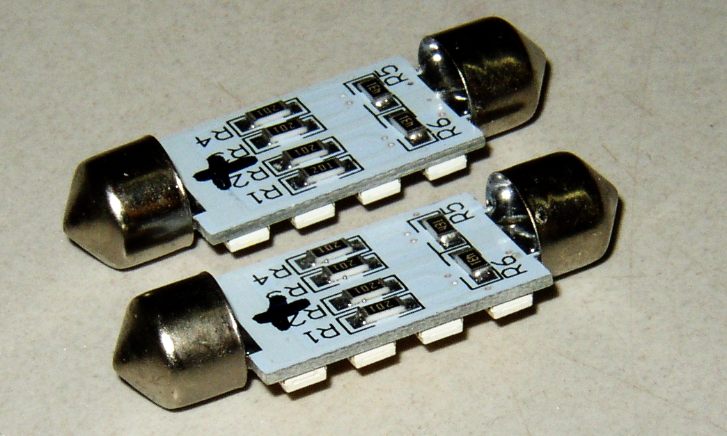 I wanted to try something different for lights like LEDs so I bought these from a guy on Samba for $10/pair. This is the backside showing the circuitry, they are polarity sensitive.