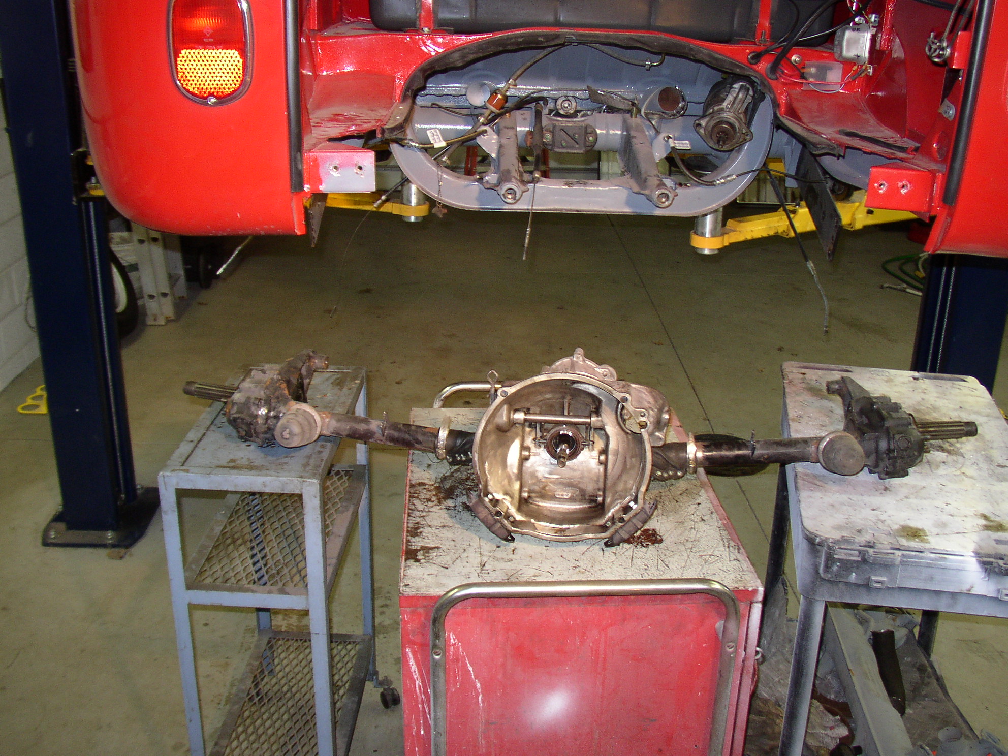 OK, tranny’s out, time to swap the axles onto the new trans from Rancho. First, set it up where you can work on it, I use a cart and a block of wood to raise the hub. I used the Bentley as a guide to do this so it’s pretty straight forward but I don’t have the 5 grand worth of specialty tools that it calls for.