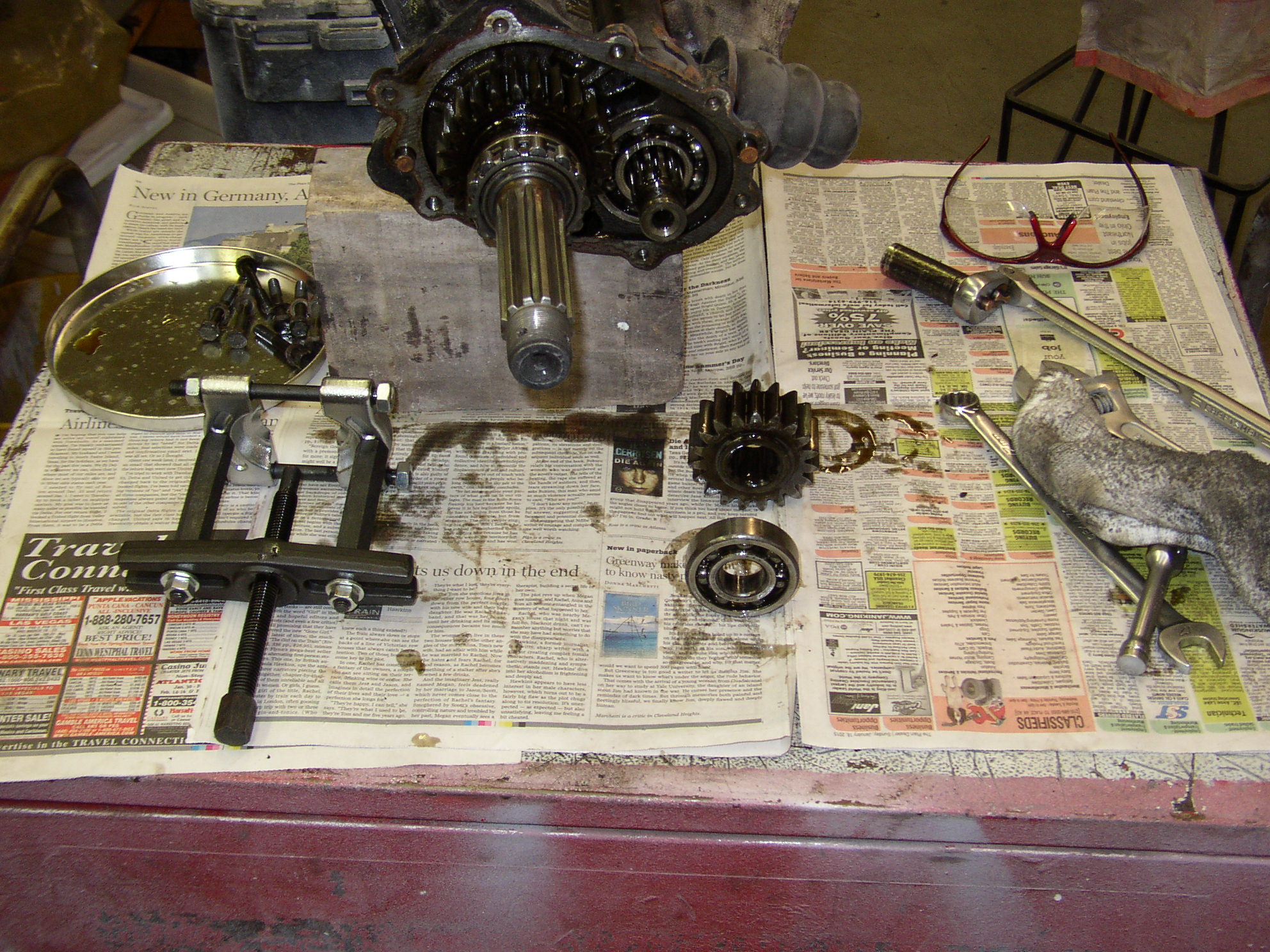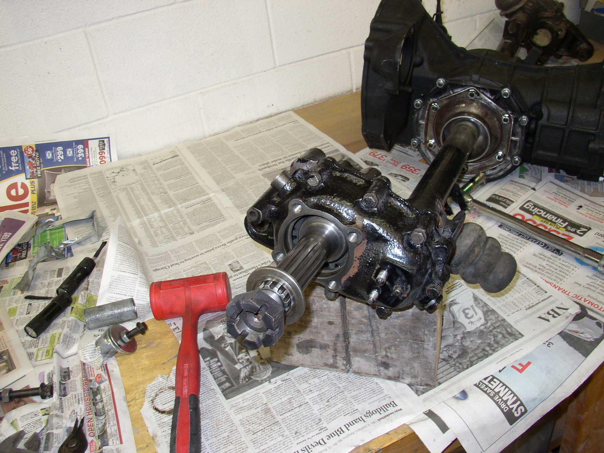 OK, tranny’s out, time to swap the axles onto the new trans from Rancho. First, set it up where you can work on it, I use a cart and a block of wood to raise the hub. I used the Bentley as a guide to do this so it’s pretty straight forward but I don’t have the 5 grand worth of specialty tools that it calls for.