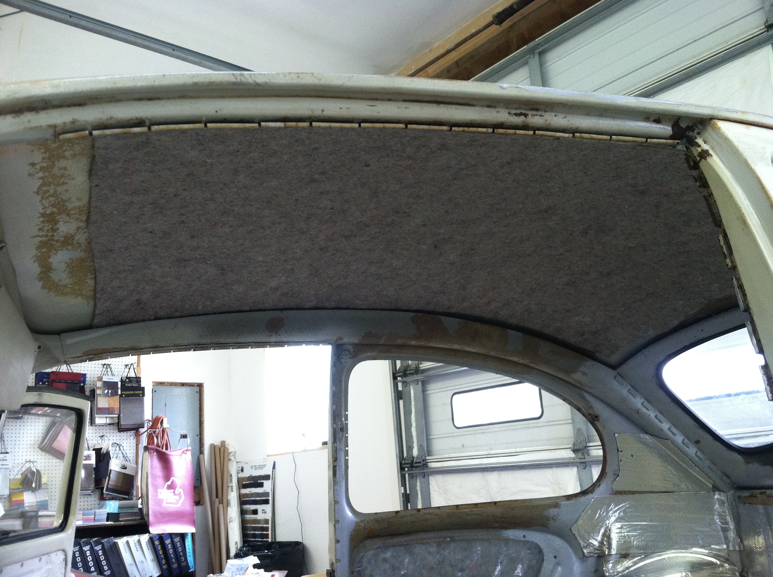 Drove down to Clinton OH to visit a long time friend Mike Johnson (Russ Upholstery) to install the headliner. Although he builds custom interior for all kinds of cars, motorcycle, boat and commercial business, headliners are not on his priority but I talked him into helping me with it. We had some problems with the back window install (wrong seal) and the chrome molding on the quarter windows so that will have to be done again. I will have to take the car to a window pro to get it done right. Not having the chrome molding seems to make a big difference in the look.