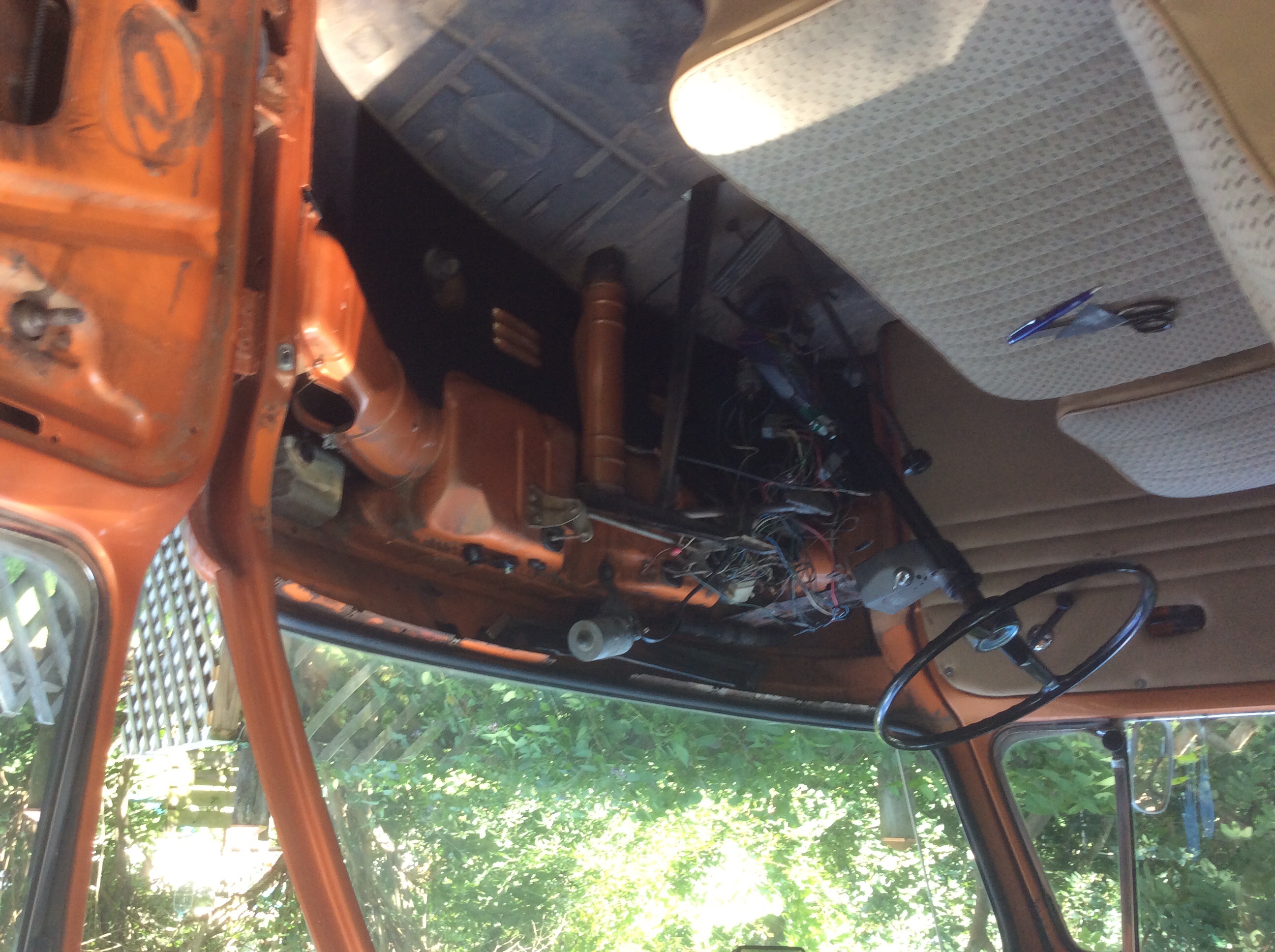First project is to replace the exhaust. I've never seen an exhaust like this and thought maybe it was some special Central American VW Part. When I saw that it was welded to the heater boxes it was clear that this was no factory exhaust. Appears to be cobbled together from several mufflers including parts of an actual VW one. I am going to replace it with a stock exhaust and J-tubes until I can locate some good heater boxes. Not planning to drive this during the winter anyway.