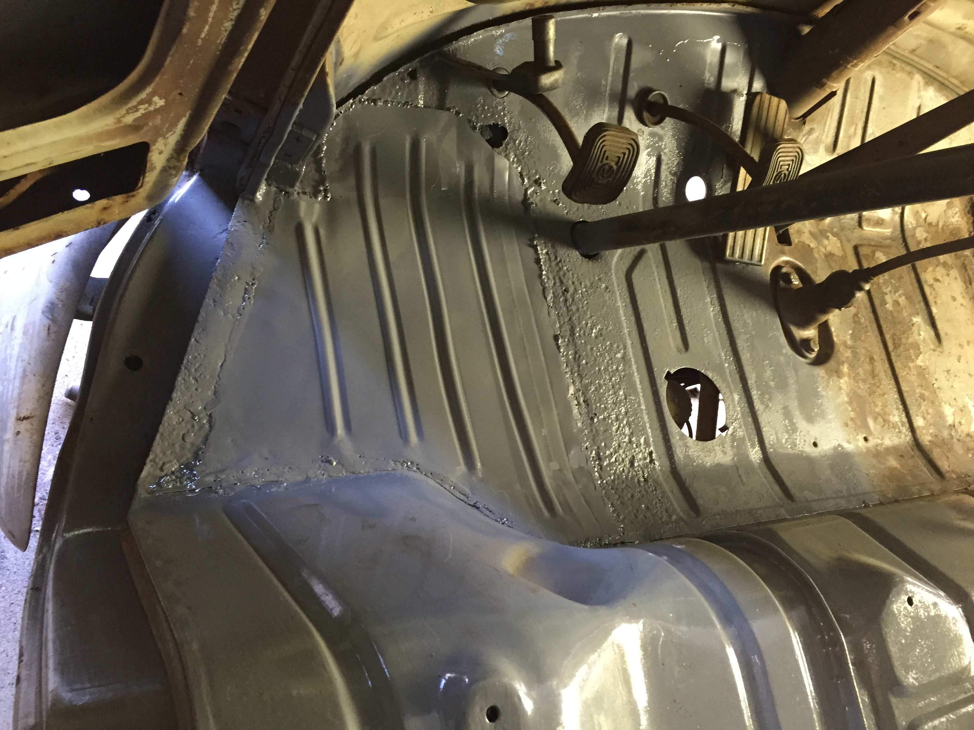 finished welding in driverside floor pan .....n paint ....home made repair panel ....