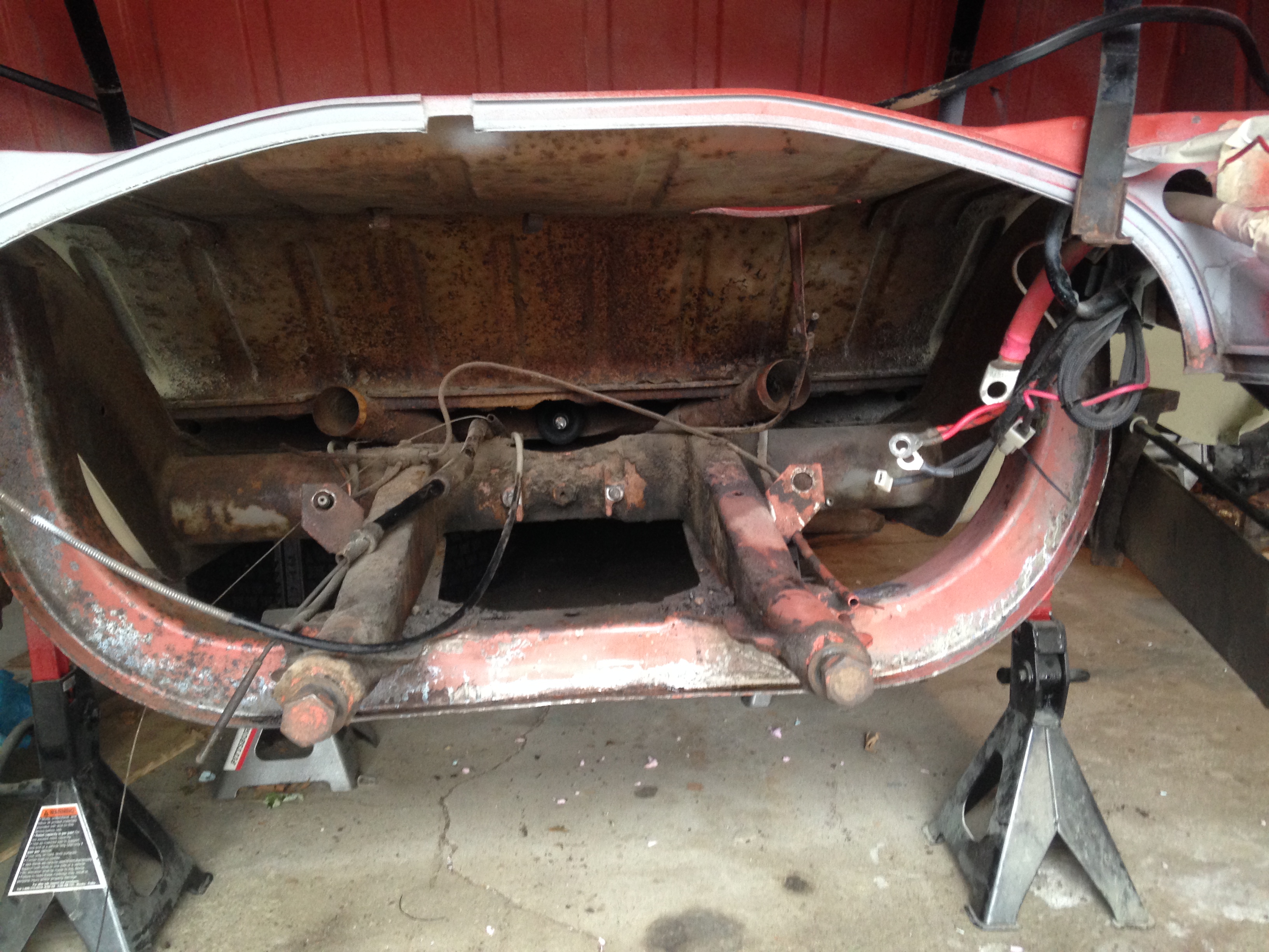 The original engine has been removed so I can clean and prepare for the new engine install. While I was cleaning I realized there was a lot of dirt under the gas tank. So I took that out. Then while I was cleaning the underside I realized I couldn't quite get to all of the spots under and behind there, so the transmission came out. I will be cleaning that too.