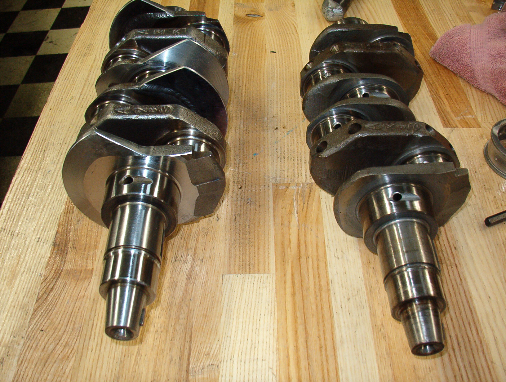Welded on counterweights,balanced and polished. all journals measure perfect standard.Stock crank on the right.