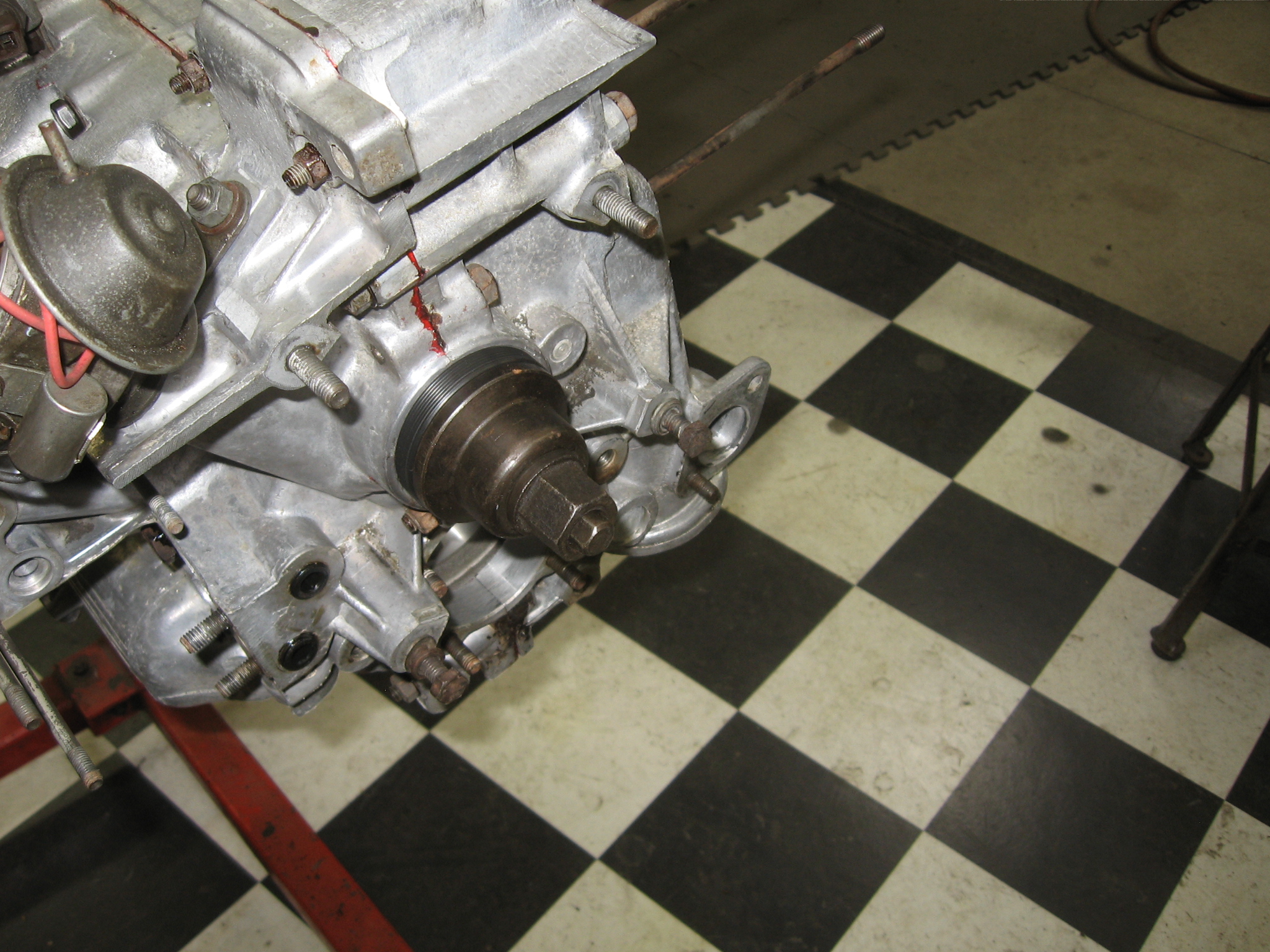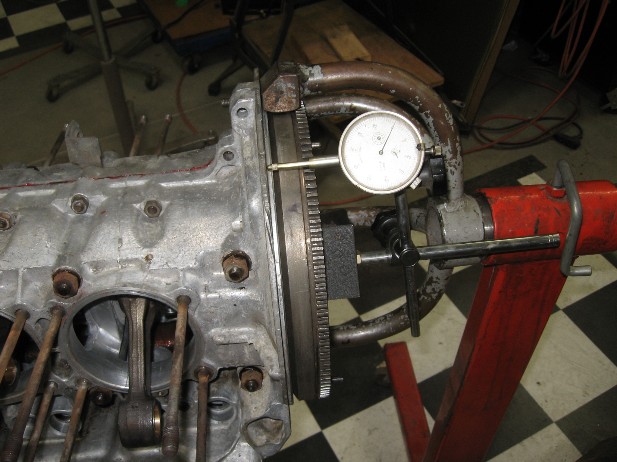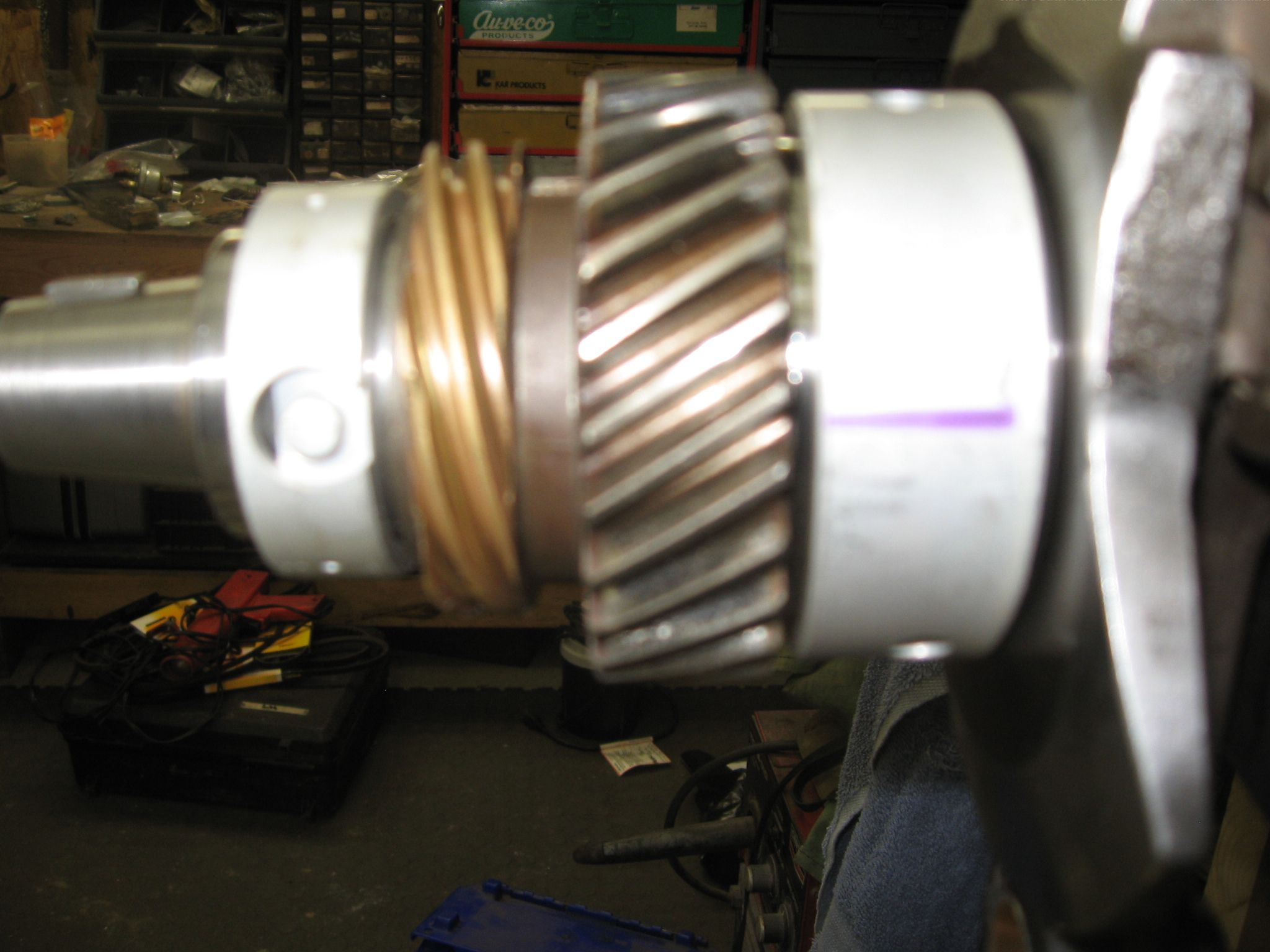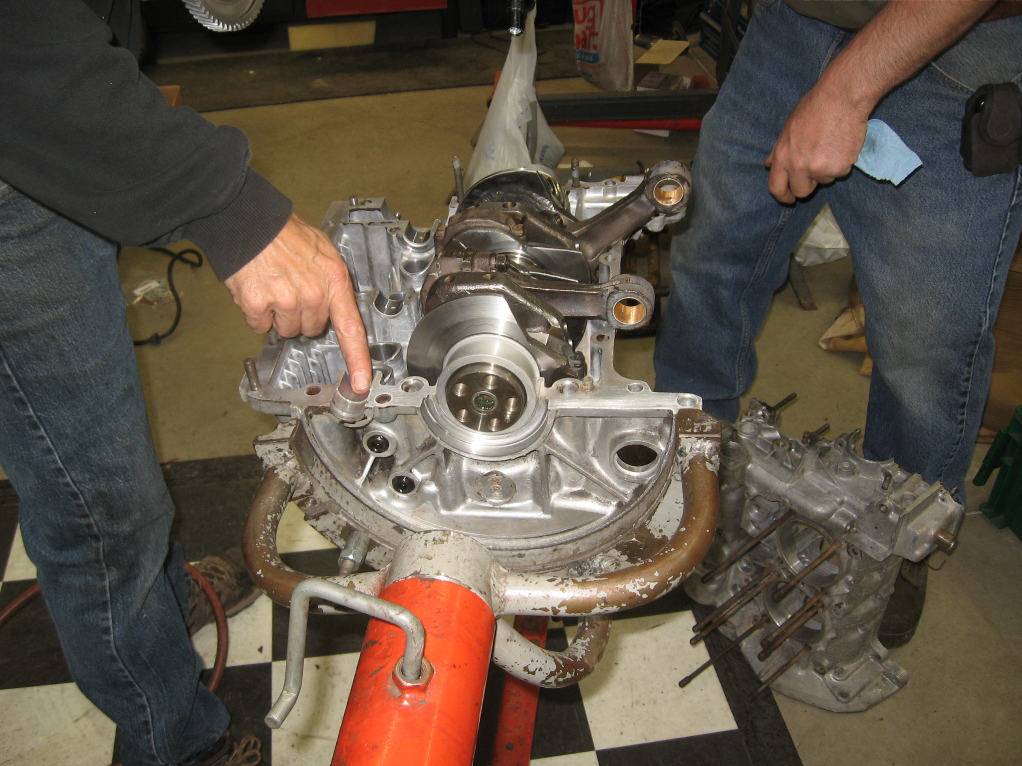 spec is .003-.005 We were at .005. Good to go. a few more rotations,everything is looking good. Install the front and rear crank seals. (T4 has one on the fan end also.) Put a little lubricant around the inside of the seals,install the oil pump. Installing the flywheel now makes it easier to turn the engine over for the installation of the pistons.