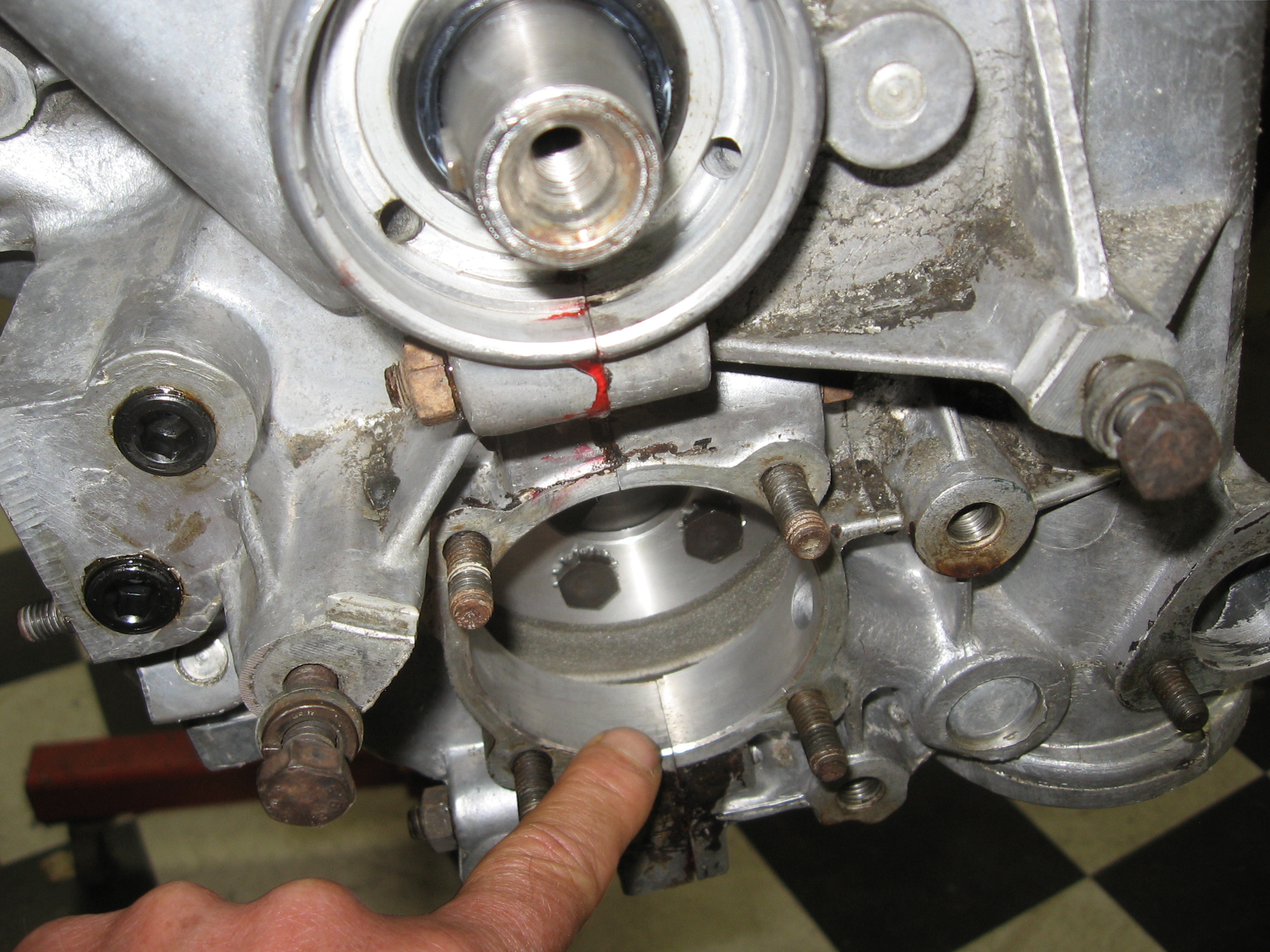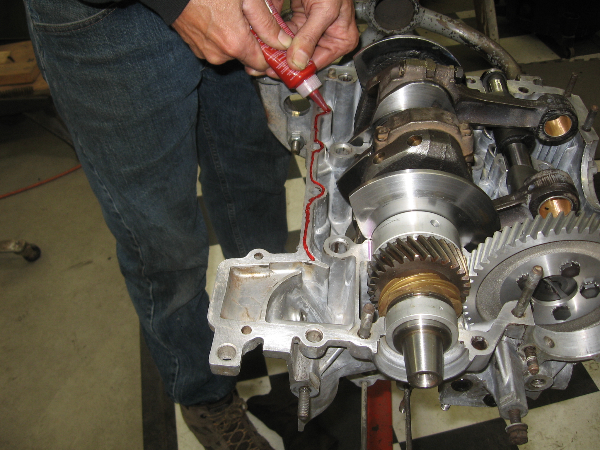 I have used several different sealers for this and they all work. I have used Locktite 518 the last several times and so does Chuck. a thin bead,then smear it with your finger. Don't forget the cam plug. concave side faces the cam on all engines except T1 auto stick. we used permatex 3H around the outside of the cam plug. Set the right case half over the studs. There are 20 case bolts on the T4 motor along with washers.Three of them are easy to overlook.1 at the bottom front in the bell housing area,1 in the deep recess on the bottom,this is the 71mm one that holds the oil pick up,and one below the oil cooler in the left case half. the 6 main ones around the crank get torqued first ,from the center out.
