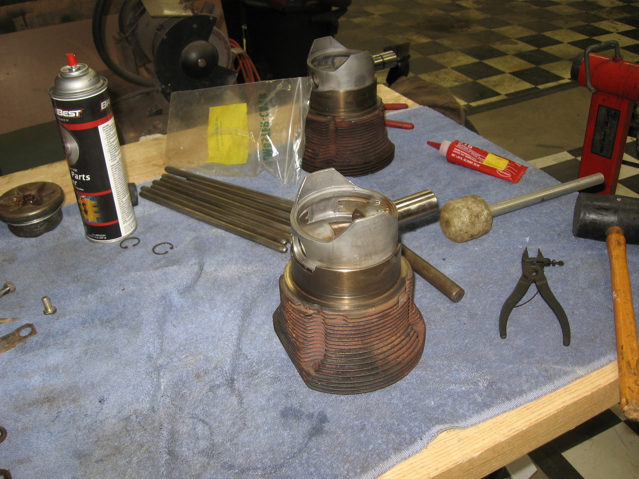 We are using the pistons and cylinders that were in the engine. the cylinders were honed,pistons soda blasted, and we are installing new rings. Grant rings on the Mahle pistons. Clean the ring grooves. A old piston ring works well (break it to get into the grooves). Spray the grooves with break cleaner.