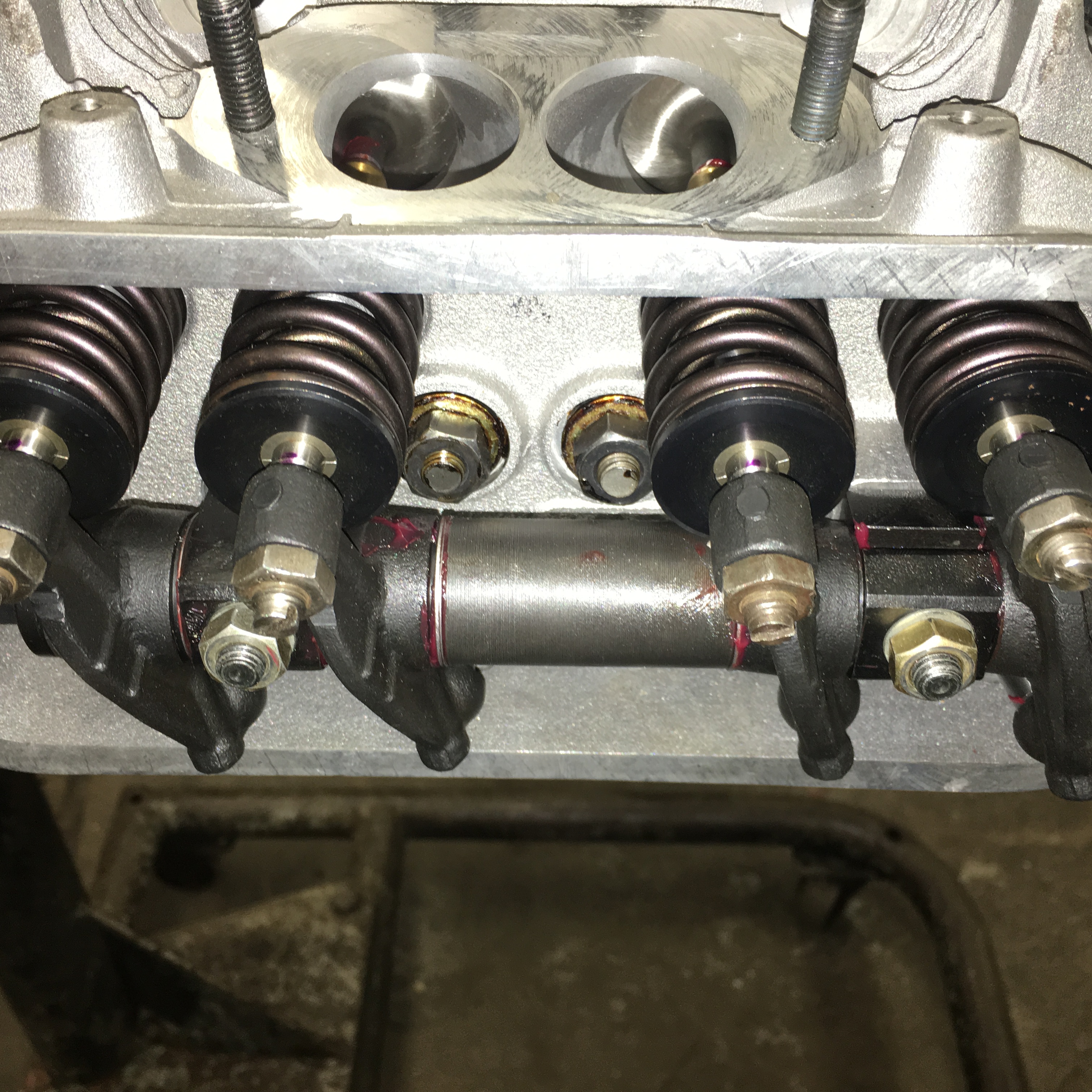 Then onto the rockers, solid shafts are relatively easy to assemble. Mostly playing around with different size shims to get the right spacing to hit the valve tips in the right spots and minimize endplay.