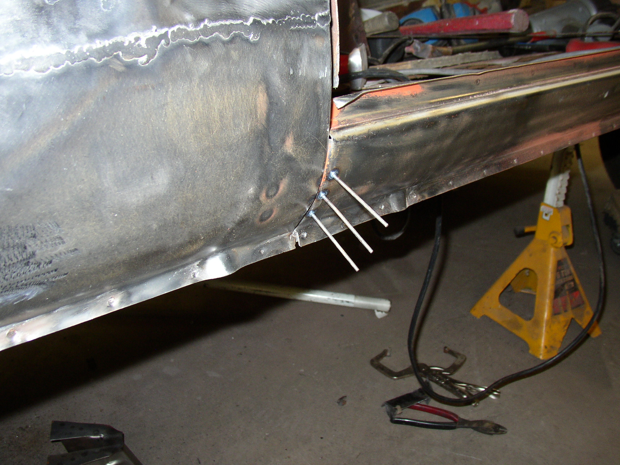 The curvature of the outer rocker was slightly off so I used Chuckie’s stud gun to bring the curve out a bit. I also used his spot welder for the bottom pinch welds. Thanks, Chuck!
