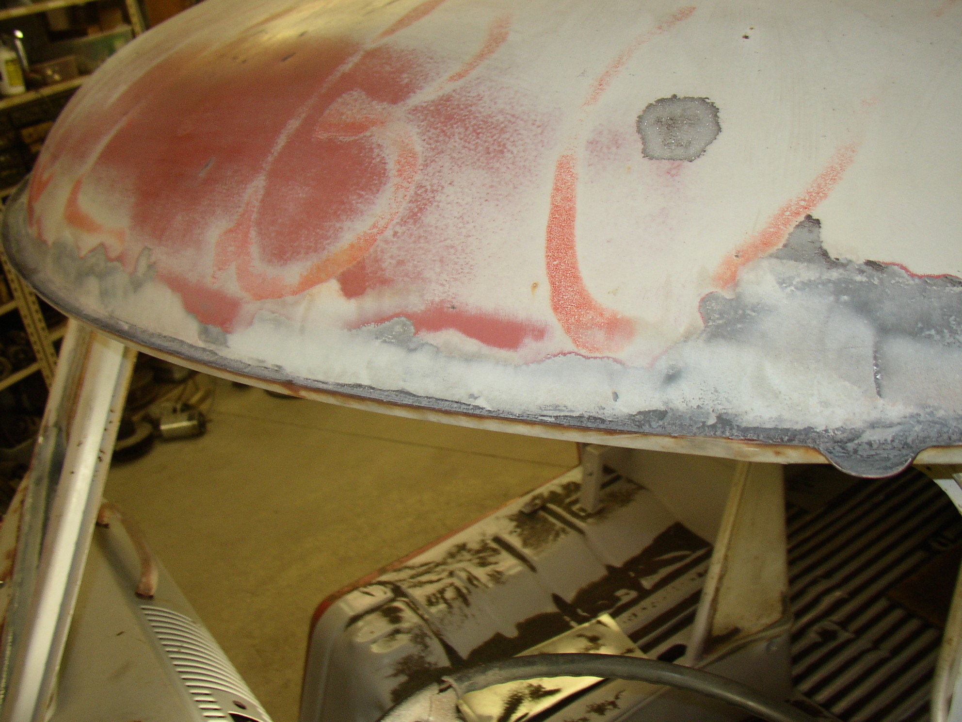 Sandblast the entire gutter and rust spots in the roof, luckily there was no rot there.