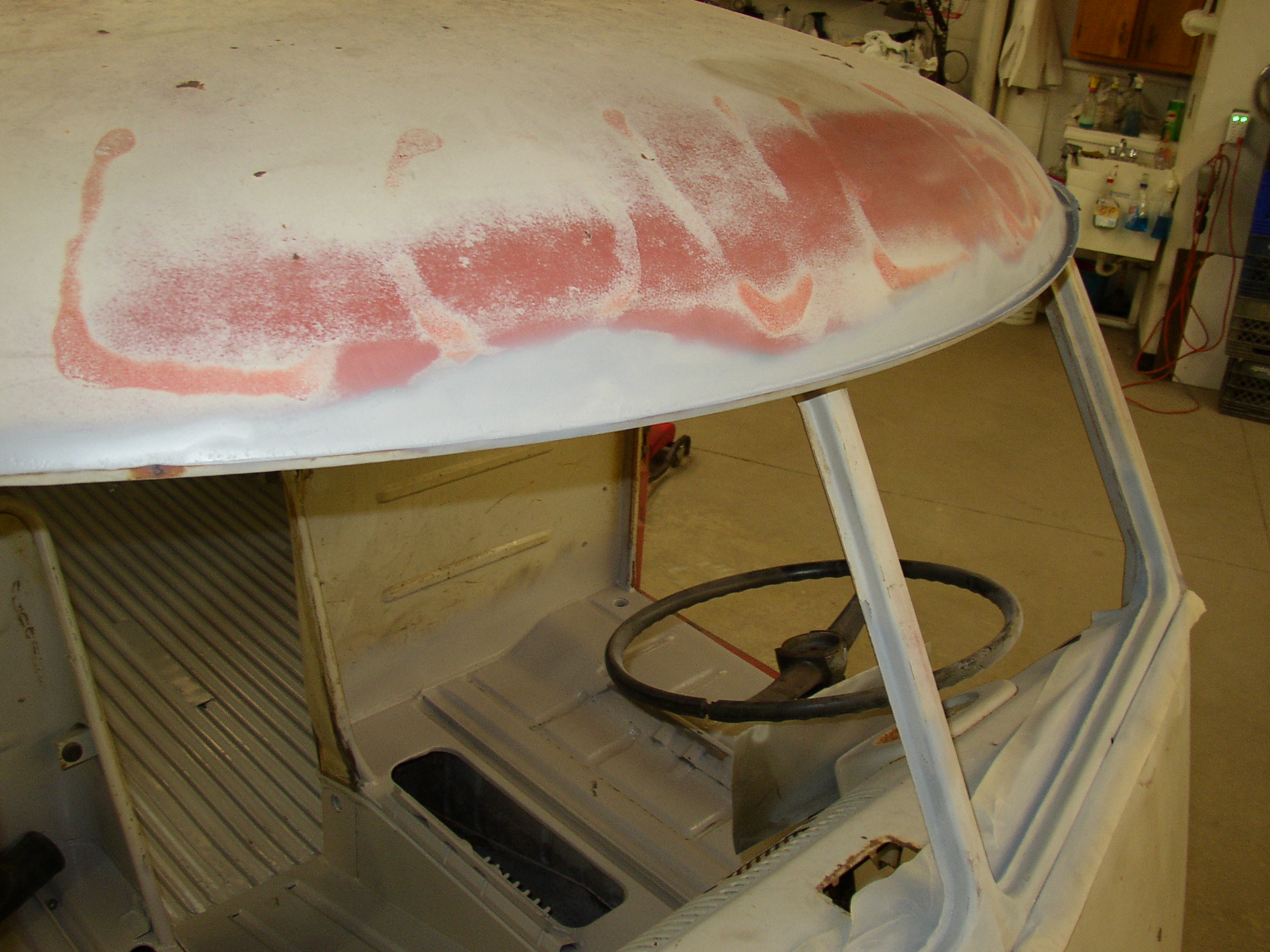 The decklid was a mess and I have a better one. I wanted to keep the one original to this bus but I didn't want to make a weeklong task of welding metal. It was only rotted in one place- just outboard of the glass area (not under the rubber, oddly enough) on the horizontal surface of the window ledge. Looking at it, I wonder if the Texas sun was reflecting off the glass at the right time of day and baking that particular area. The bottom of the decklid is beautiful, but just outboard of the glass it was severely pinholed. I took the shortcut route- sandblast it really well, epoxy up the pinholes, (Swiss cheese), and prep/paint. It actually came out much better than I anticipated. I tried (unsuccessfully) to remove some of the graffiti. I ended up removing as much OE paint as spray can.