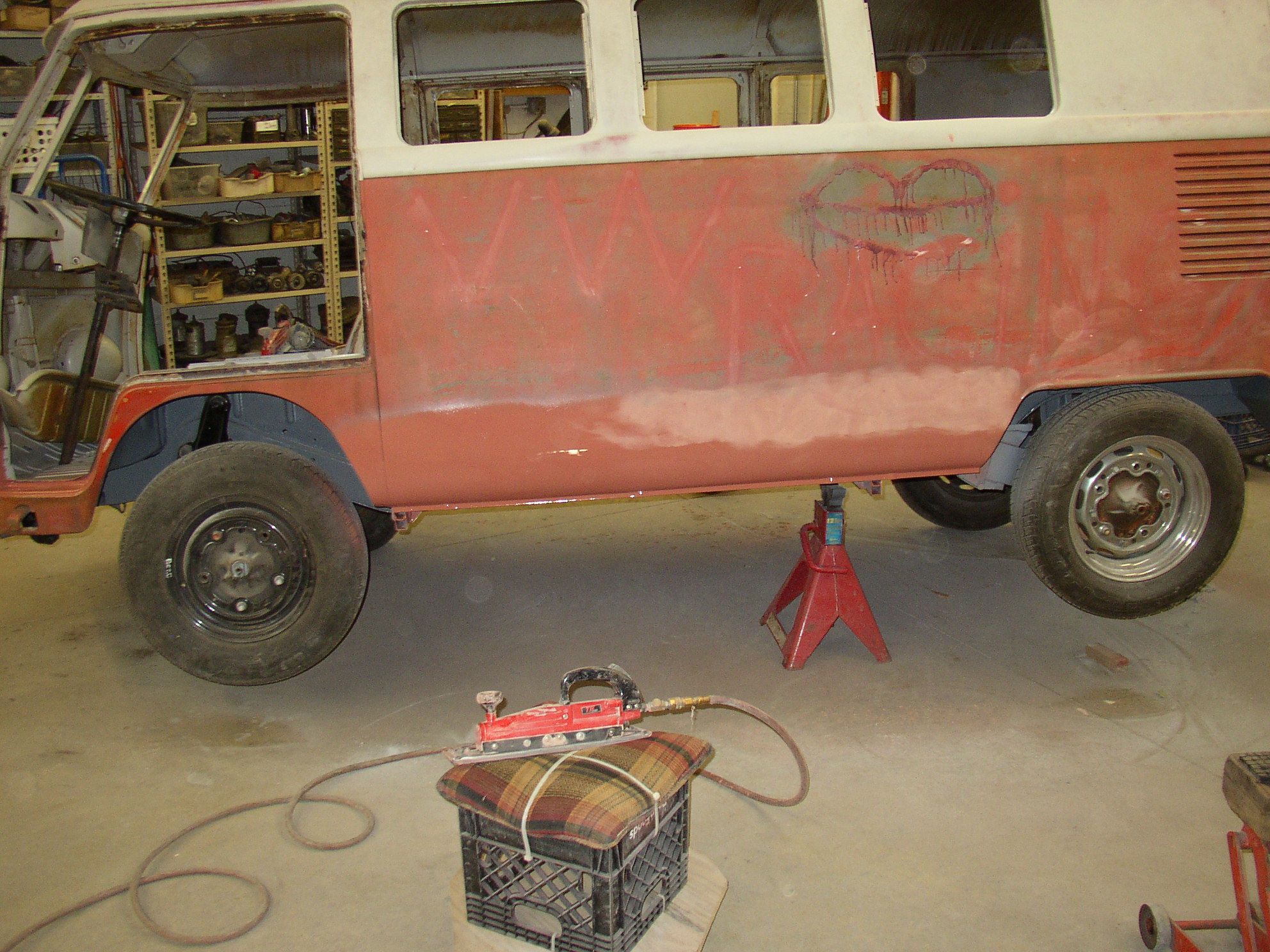 The decklid was a mess and I have a better one. I wanted to keep the one original to this bus but I didn't want to make a weeklong task of welding metal. It was only rotted in one place- just outboard of the glass area (not under the rubber, oddly enough) on the horizontal surface of the window ledge. Looking at it, I wonder if the Texas sun was reflecting off the glass at the right time of day and baking that particular area. The bottom of the decklid is beautiful, but just outboard of the glass it was severely pinholed. I took the shortcut route- sandblast it really well, epoxy up the pinholes, (Swiss cheese), and prep/paint. It actually came out much better than I anticipated. I tried (unsuccessfully) to remove some of the graffiti. I ended up removing as much OE paint as spray can.