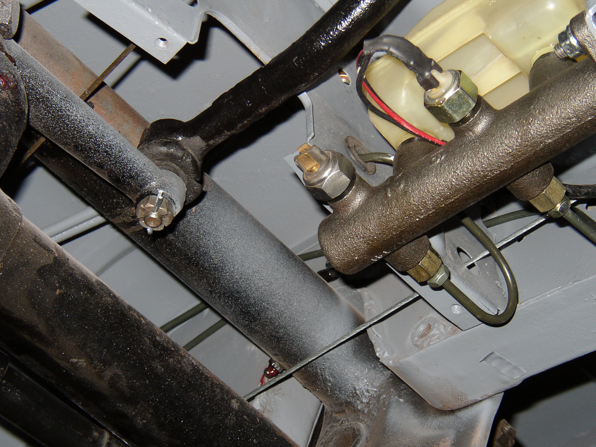Run your lines now, and you'll need another tee fitting near the MC to feed the front lines since there's only one front outlet rather than two like most have. Yes, the line goes through a grommet. I could have wired the brake light switches in parallel but I didn't see the need. The second switch is a dummy/bad switch I had on the shelf.