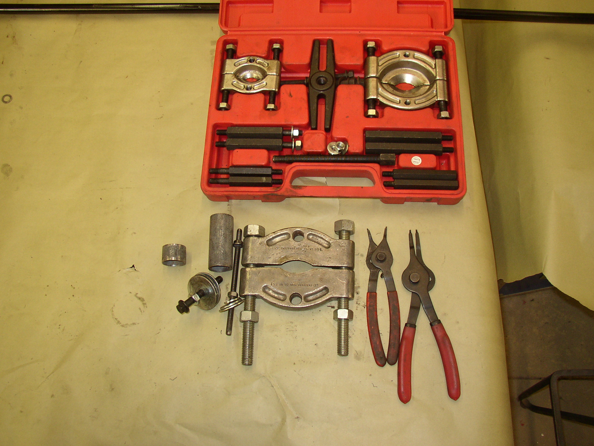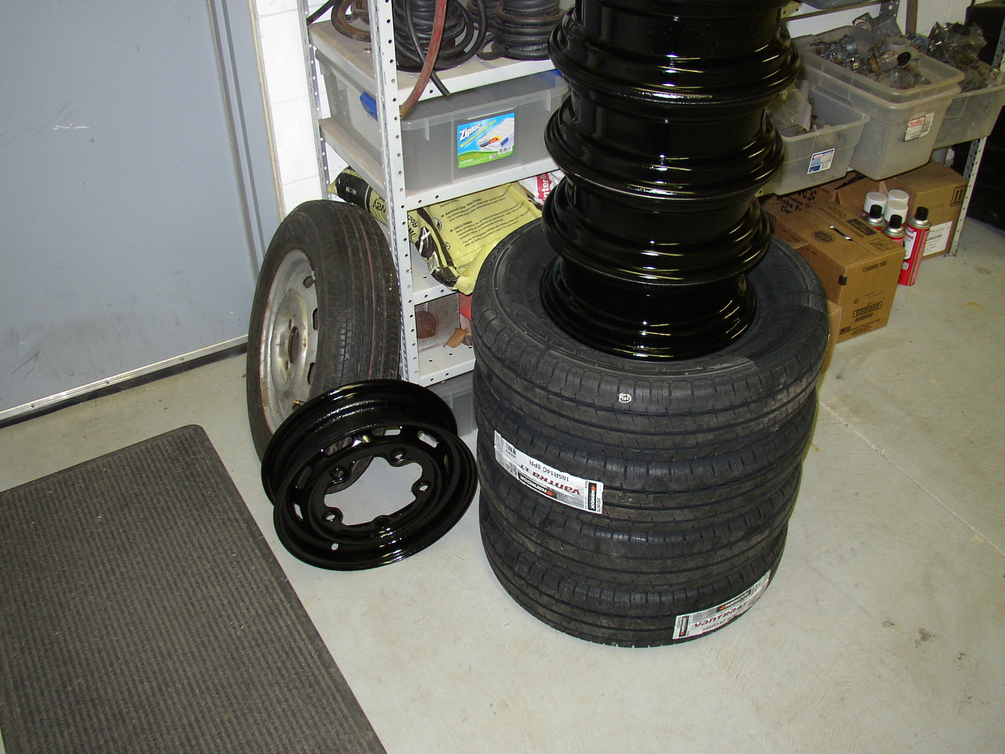 That's a hole in the side cover. Wow, what a F'ing mess. That's goop all over the ring gear and in the bottom of the case. The side bearings are seized and the input shaft won't turn. The tires came (Hankook RA18's from WalMart, $77/ea) and the wheels are ready. While the tranny's out I'm going to reset my spring plates. I can tell it will have too much camber by just rolling it around. I looked up my pics on the '66 and it's virtually exactly the same number- set to the service manual. I need to drop it back about 3 degrees.