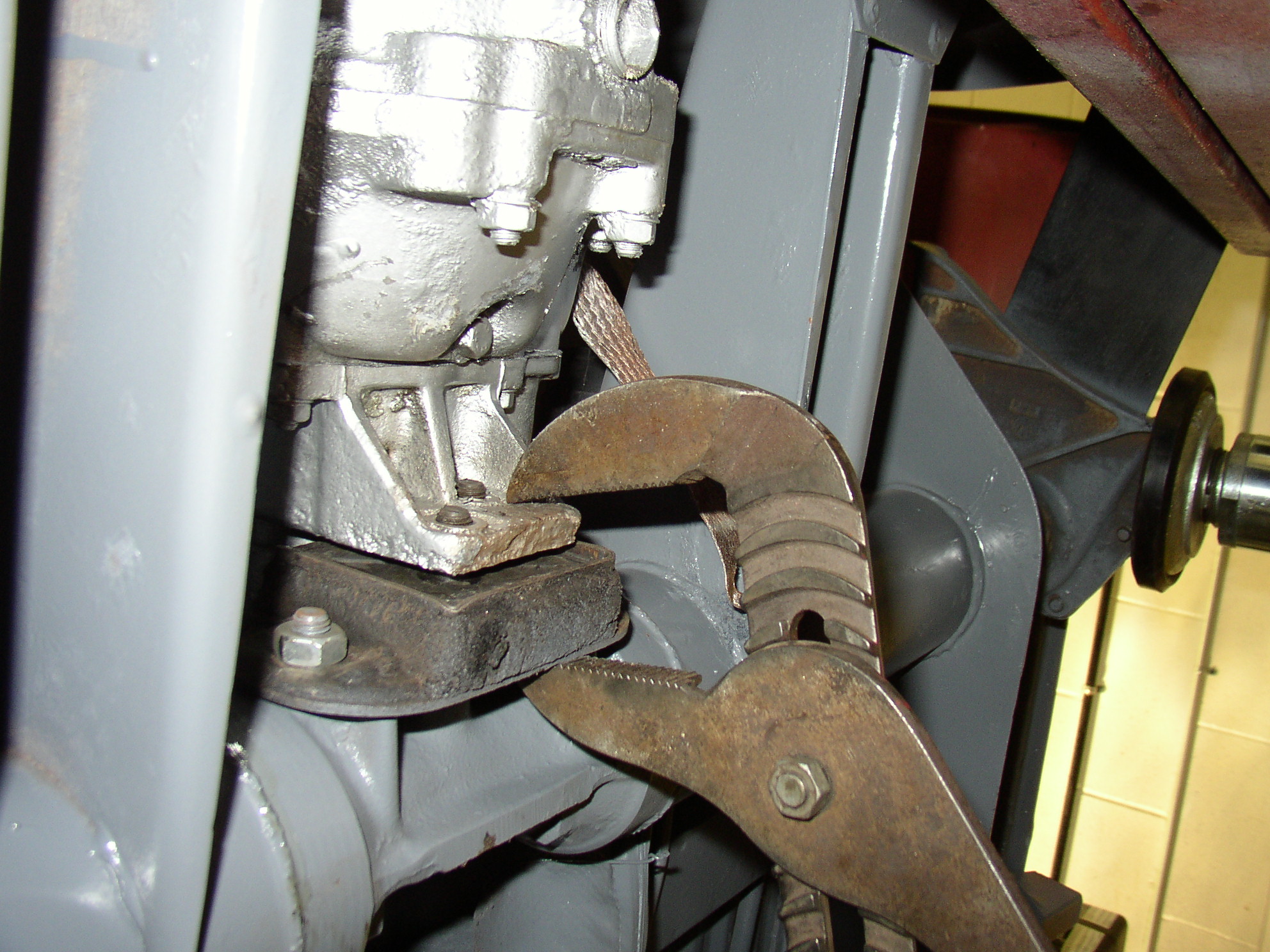 There's a sequence that's kind of important, if you screwed it up really bad you could break something. First, I put the rear mounts on the bellhousing, but leave the 4 8mm bolts/nuts loose. Note the Bowden tube is in place, it's easier now than later. Stick the whole assembly up and in, line it up and pull it into the forward mount. This is where I need the two special nuts- they're 10x1.5, but have a 15mm hex rather than the normal 17mm hex to clear the nosecone. I also need a skinny box wrench, this is where I go for the good Snappy wrench instead of the normal DD wrenches. I put the nuts on and bring them down, but not tight yet. Leave them relaxed so the nose can move around in them if needed. Put the two monster bolts in the frame horn and tighten them. Now, make sure the case is level, I eyeball it, but you could use a level if you're geometrically challenged. The tranny needs to be level in the body for two reasons- first the engine looks stupid if it's setting at an angle. Second, your shifter might be wonky if the tranny isn't level. Now tighten the rear mount bolts/nuts, notice they're still loose in this picture. Then go back and put the final torque on the funny 15mm nuts up front.