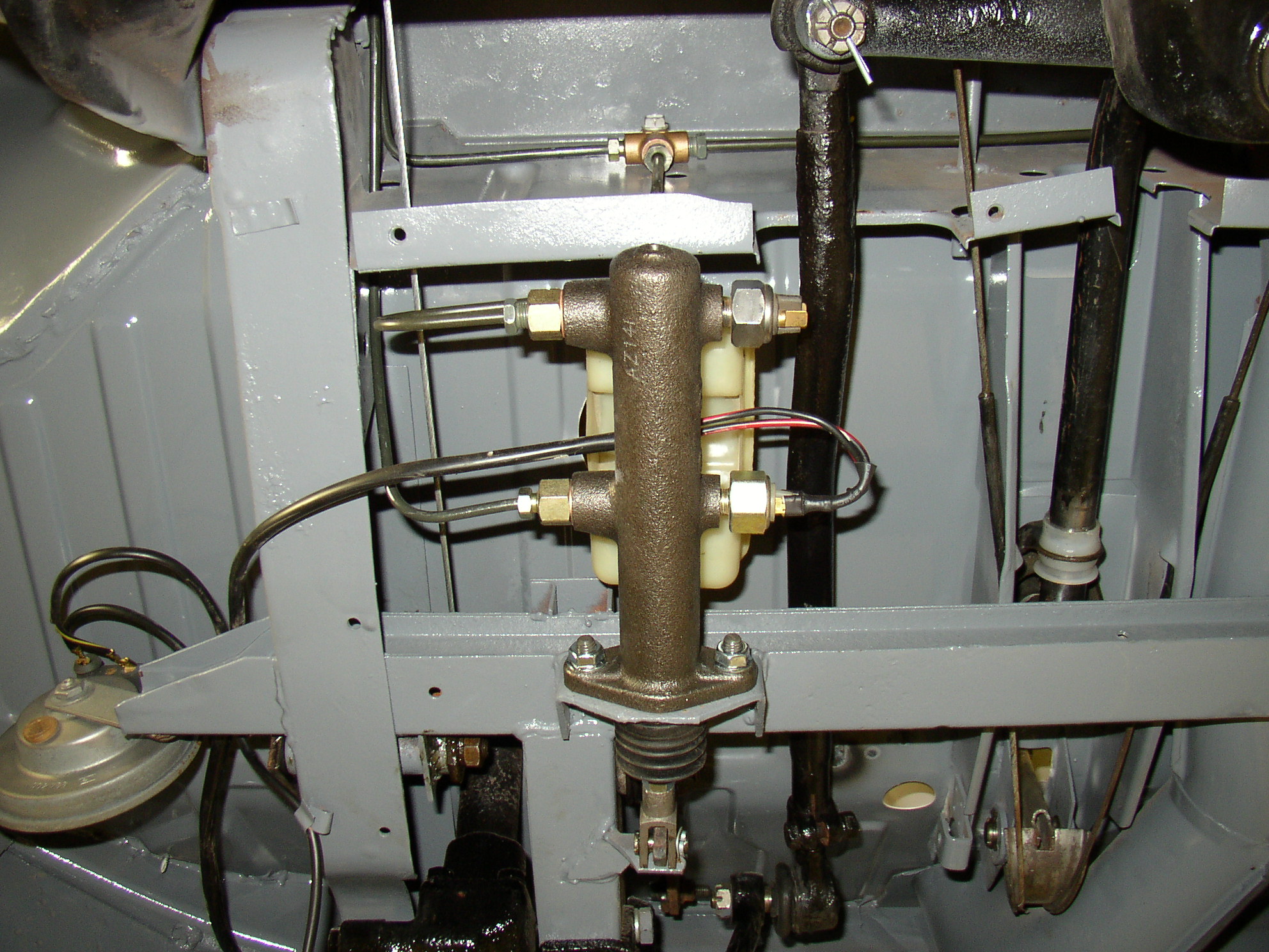Now that '67 master cylinders have become realistic in price, I decided to go that route, buying the cheapie one from Cip1 and a $1 Rabbit reservoir from the Toledo swap meet. Sellers have the reservoir new but it's not cheap like me.