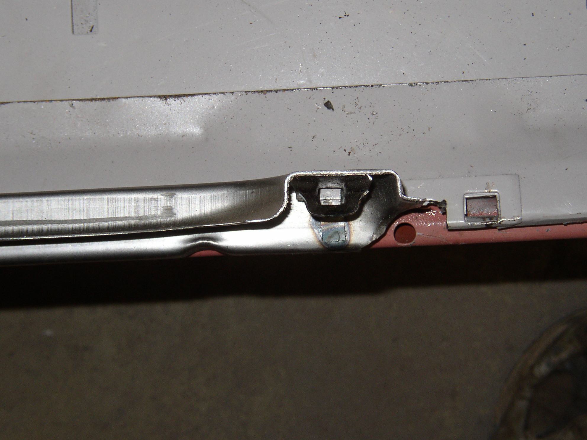 So drill the spot welds partially through to weaken them, then pop them apart with a screwdriver. Here's the bottom, compare it with the rotted OEG- not that much different. Open up the hole with a square file to bring the lock rod about 3/8" outboard. Test fit it. Clamp the guide back in using a hex nut as a spacer. Weld it in place, Drill some holes for plug welds, someday I'll buy a spot welder instead of borrowing Chuck's. It's not going to see daylight inside for a long time so shoot it with some weld-through primer.