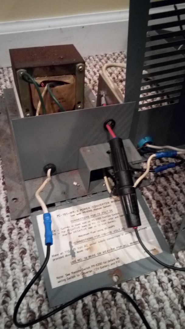 I installed a 20 amp inline fuse and extended the temporary test lines to the fridge. Figuring out the rat's next under the thermostat took a while; I could have hooked up the heating element directly to the transformer and call it a day, but I wanted test the dial knob too. Here is the diagram, the fridge wiring is the rectangle in the middle and here my hookups at the triple connector under the Tstat