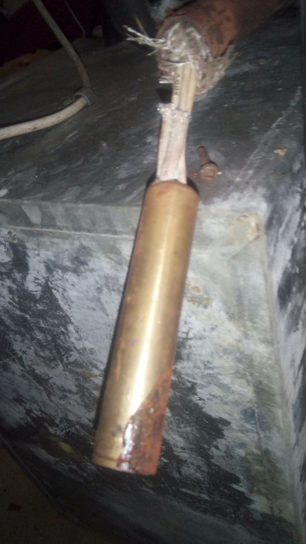 The yellow wire nuts and the electrical tape on the insulation mean that a PO messed with the unit. Removal of the bottom insulation reveals the heating element, hidden inside a tube welded to the coolant line you can see the tip of it inside the tube; admire the ghetto clamping screw! The heating element slides out easily; the first problem is that there are four wires coming out of it, instead of two Notice the stamping for both 12v and 115v, which means that it belonged to a canadian model - with separate circuits for battery and shore power. Next I removed the fabric insulation to expose the entire length of the wires, so I can separate the 12v pair from the 112v pair. I assumed that the 12v pair was the one initially hooked to the blue and black wires on the socket; I actually lucked out on it.Testing is easy - just hook up the wire pair to the battery terminal - I don't think polarity matters the element started immediately, and was piping hot within 20 seconds So the heating element is good!