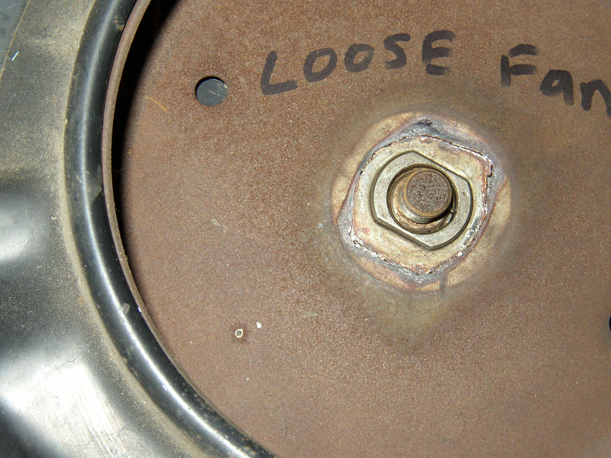 By all outside indicators, this looks like a really nice virgin low mileage engine. Throttle shaft is tight in the carb, almost all original components, nice end play and no vertical movement in the flywheel. Good compression (135-145) across all 4, runs good with no noises and starts right up. I have high hopes for this as a spare engine. I bought it at a garage sale from a widow whose husband was going to build a kit car but died first. I'm thinking I got lucky on this one. Fan hub was broken, no big deal. '74 AH case. Strip it down to retrim it to a generator setup and make sure the fins are clean. Cut the EGR flange off the intake manifold. Run a 3/8" tap into the hole, bottom a 3/8" bolt into it, cut it flush with a whizzer and grind it smooth. I don't know how you guys get stuck gen pulleys off but here's how I do it- weld a homemade puller onto the pulley and burp it loose. You can cut the puller from the pulley and re-use it with a bit of grinding, that surface is not used when in operation. Here's something bizarre when it was on the run stand- the bellhousing adapter is bolted tight but not grounded! Ted would call this a voltage drop of 12v when it should be under .1v