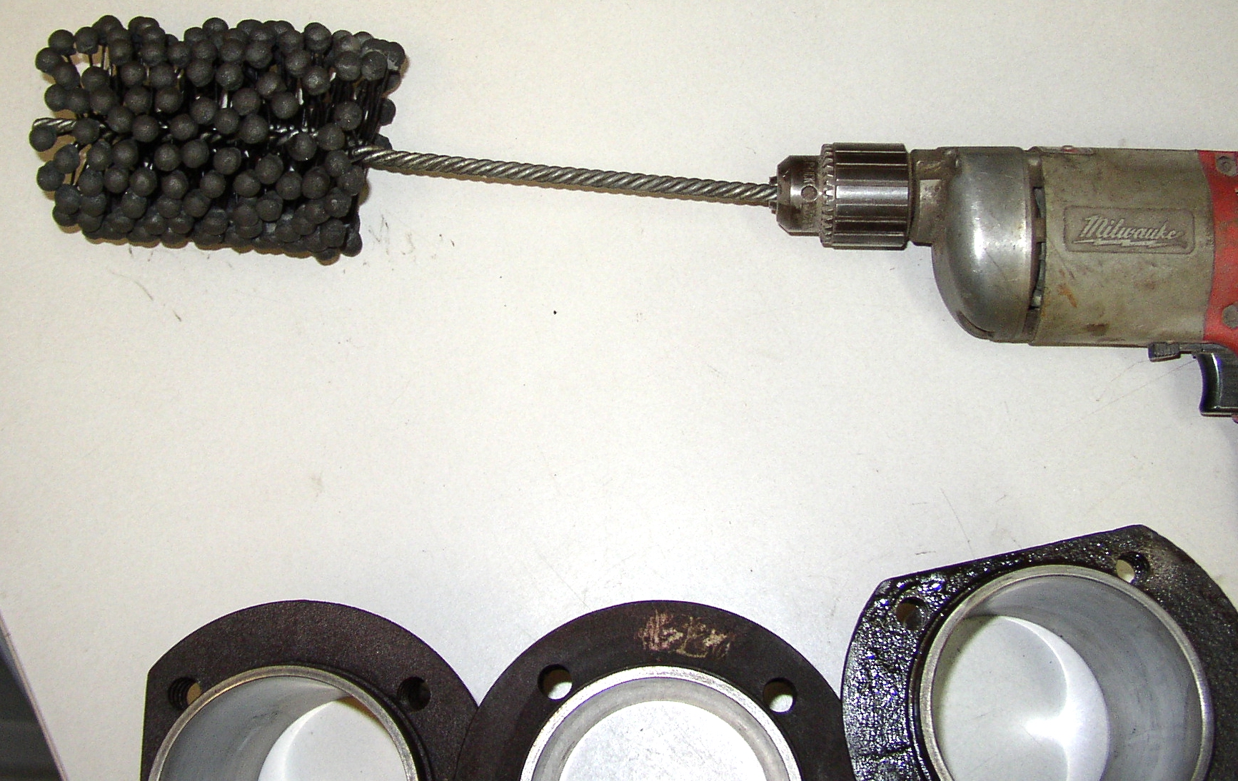 I left off with the short block assembled on the 1600 CW engine. I had some nice jugs with low mileage on them so I ball-honed them for re-use. For those who don't know what a ball or bottle brush hone, this is it, they work great. It's hard to get a 30° crosshatch but I try. I use a mixture of oil and K1 in a coffee can for lube, do it outside as it makes a mess.