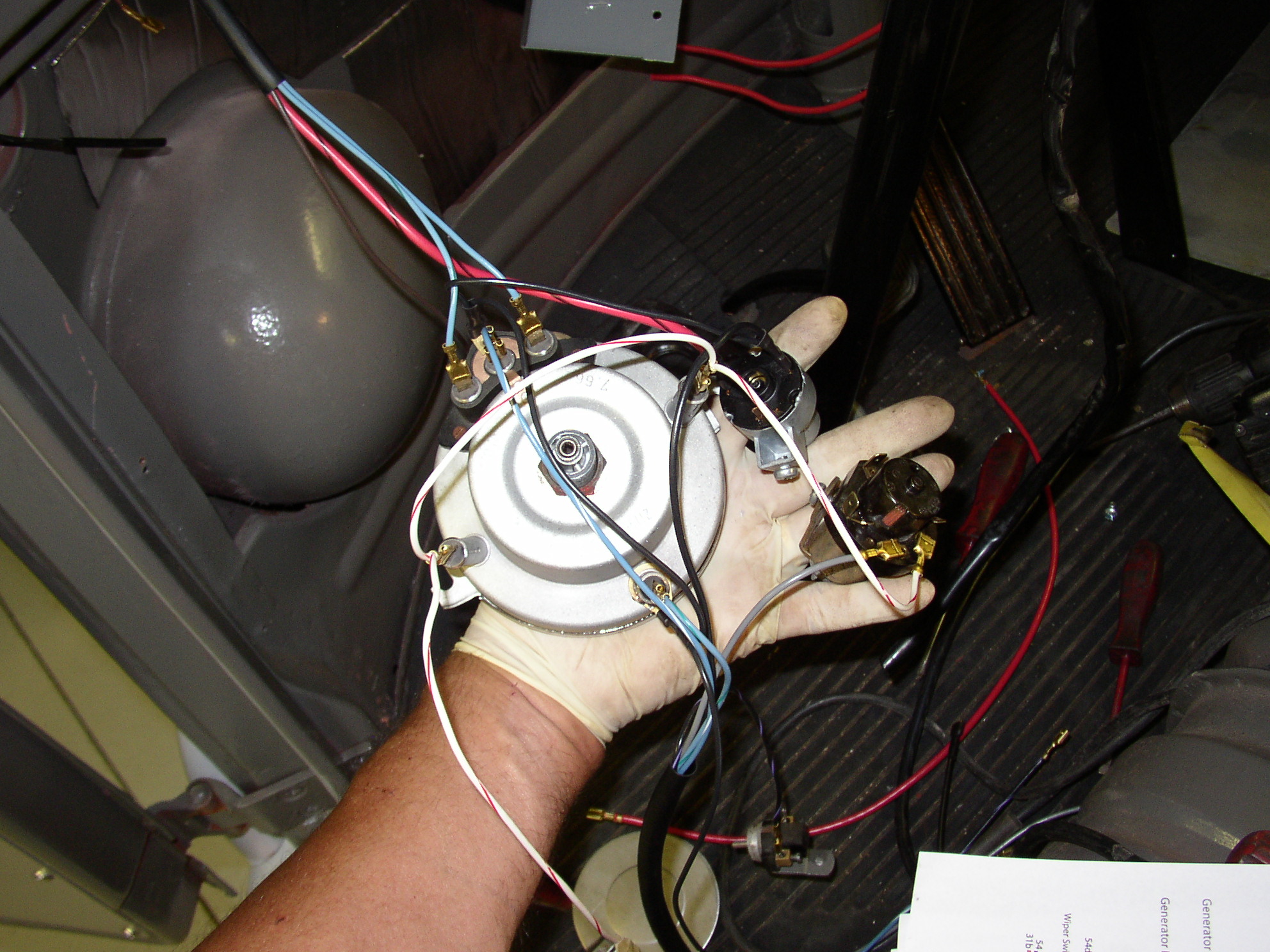 At my age, I'm not keen on chasing electrical problems every time I want to go for a spin. I remember all the problems I had with my old '59 with an old harness and screw on terminals. Sure it was original, but original ain't fun when you have no blinkers one day or one or the other brake light is out the next day, or the horn doesn't work or the headlights suddently go out. Begining with the starter, the same pattern was emerging with this bus. While I realize for most folks the wiring in these old buses isn't that complicted, but for me, I decided to have Bruce handle it and I knew it would be done right.