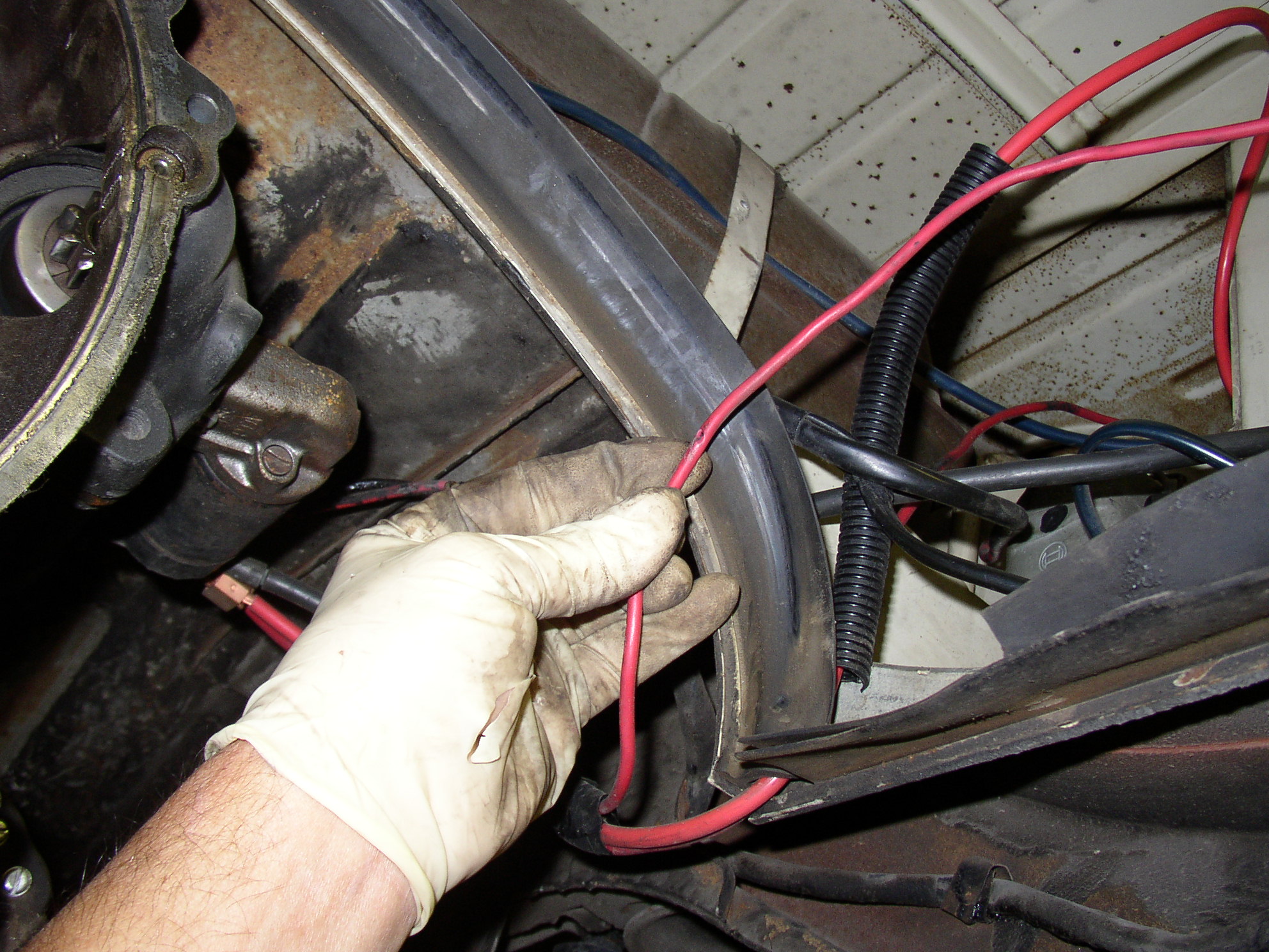 Here's an unfused 10ga wire rubbing on a bracket, ready to short out and start a fire. Voltage regulator feed wire, yech. Coil feed, yech.
