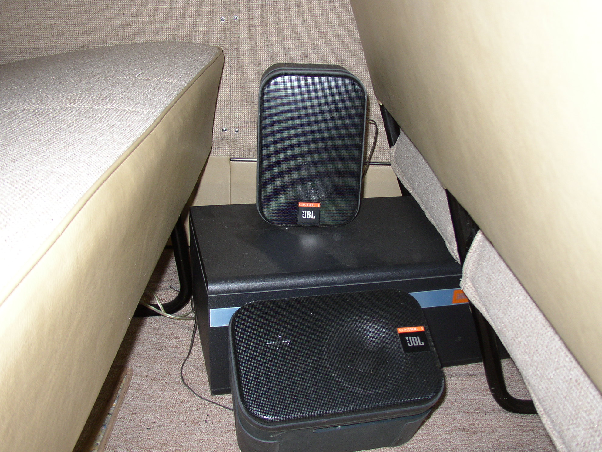 I bought a small power amp for the stereo last year and finally found time to install it. The red thing is a USB jump drive holding several thousand songs, you can see other MP3 input ports on the adapter too. (I installed the stereo a few years ago). The power amp feeds the JBL Control 1 monitors and subwoofer that I bought 30+ years ago and recently had reconed. Before I was married those were powered by a 200w amp and really kicked ass! These accompany the small Bose front speakers I have behind the front seat cushions. The amp works fine but it's only 15w/channel so you can't expect thumping lows.