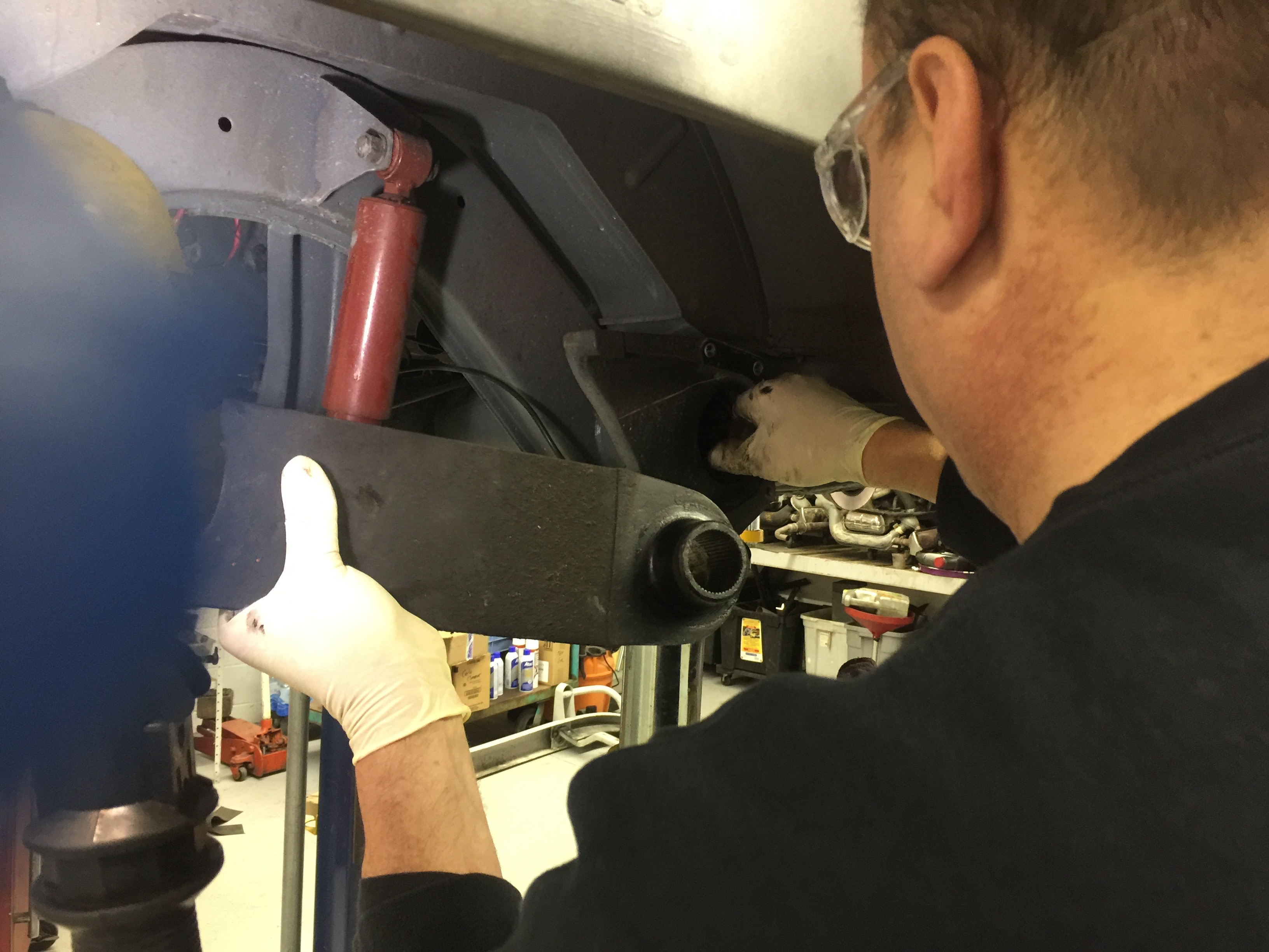 So we're getting to the home stretch. Bruce has to take a look at the front end. My toe in or toe out is out of whack. I've got pigeon feet and it's wearing my tires. I'm short on the photos because I was too lazy to pull out the camera.