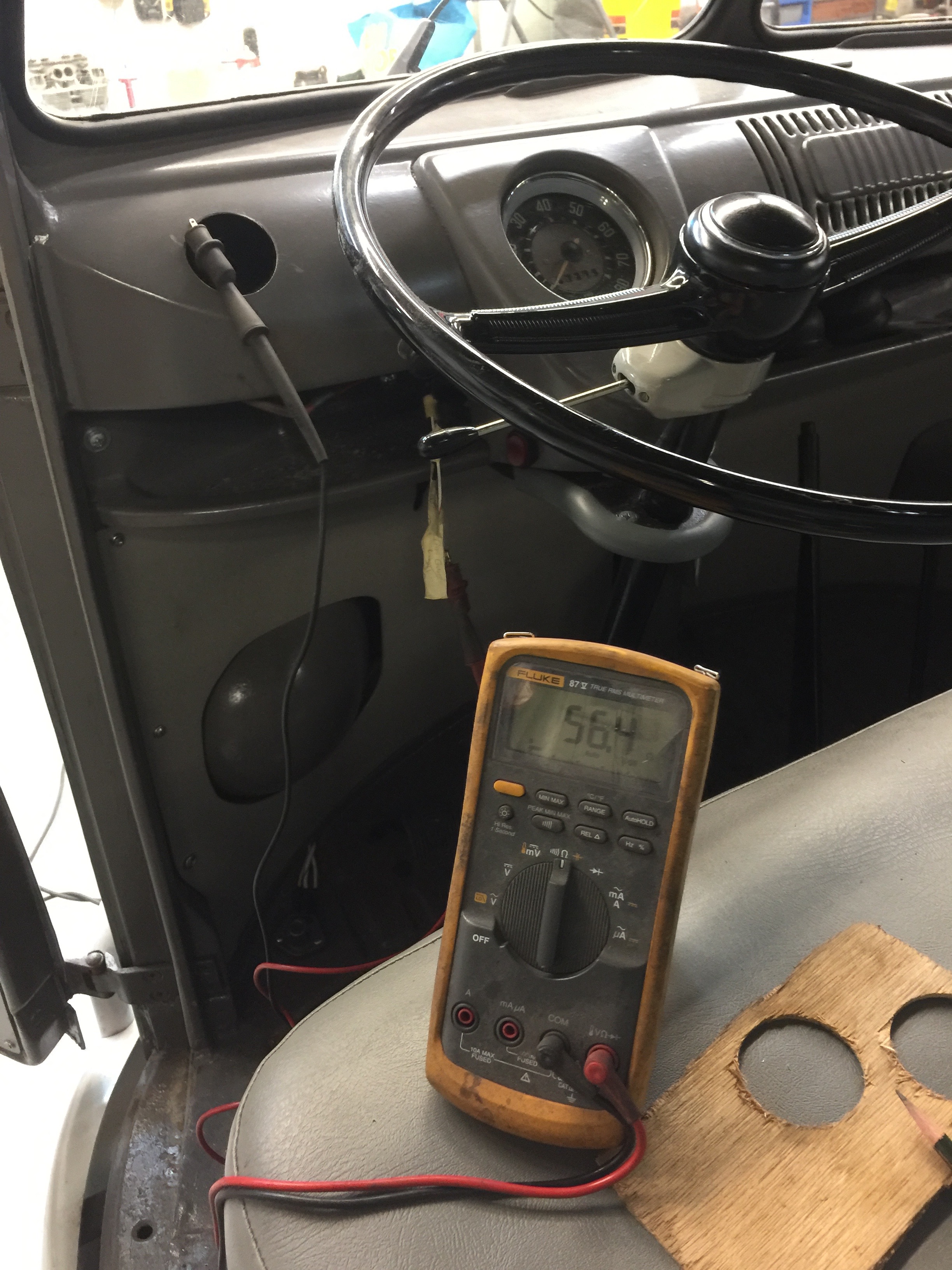 We drilled a hole for the gas gauge, installed it and I wanted to verify the sender was working correctly. I guessed 70-80 ohms with a couple of gallons, Sean guessed 60 making him smarter than me.