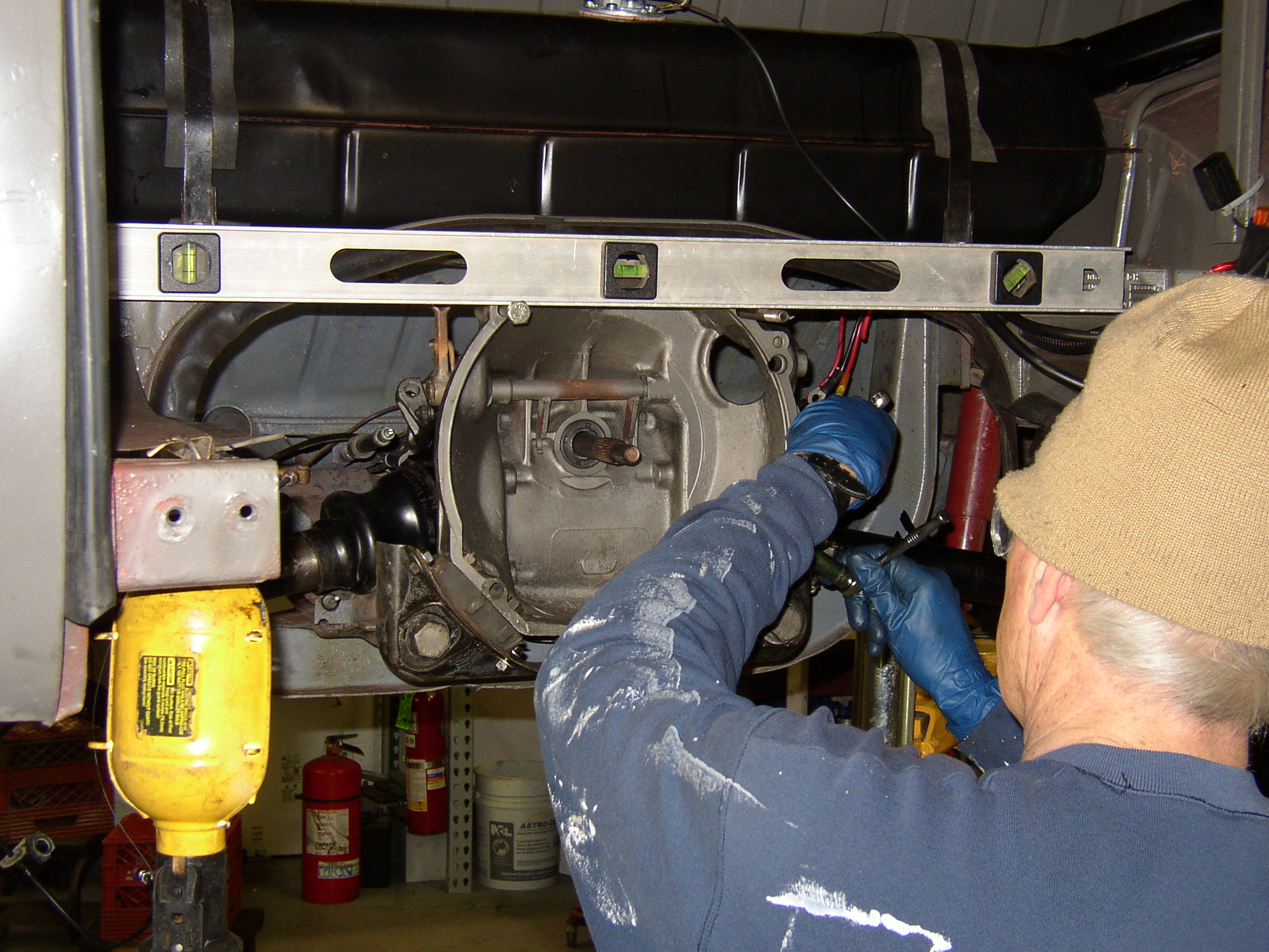 Sean putting the new VDO sender in. Measuring the spring plate angle. We had too much positive camber (about 3-3.5° on the rears) and needed to take some out.