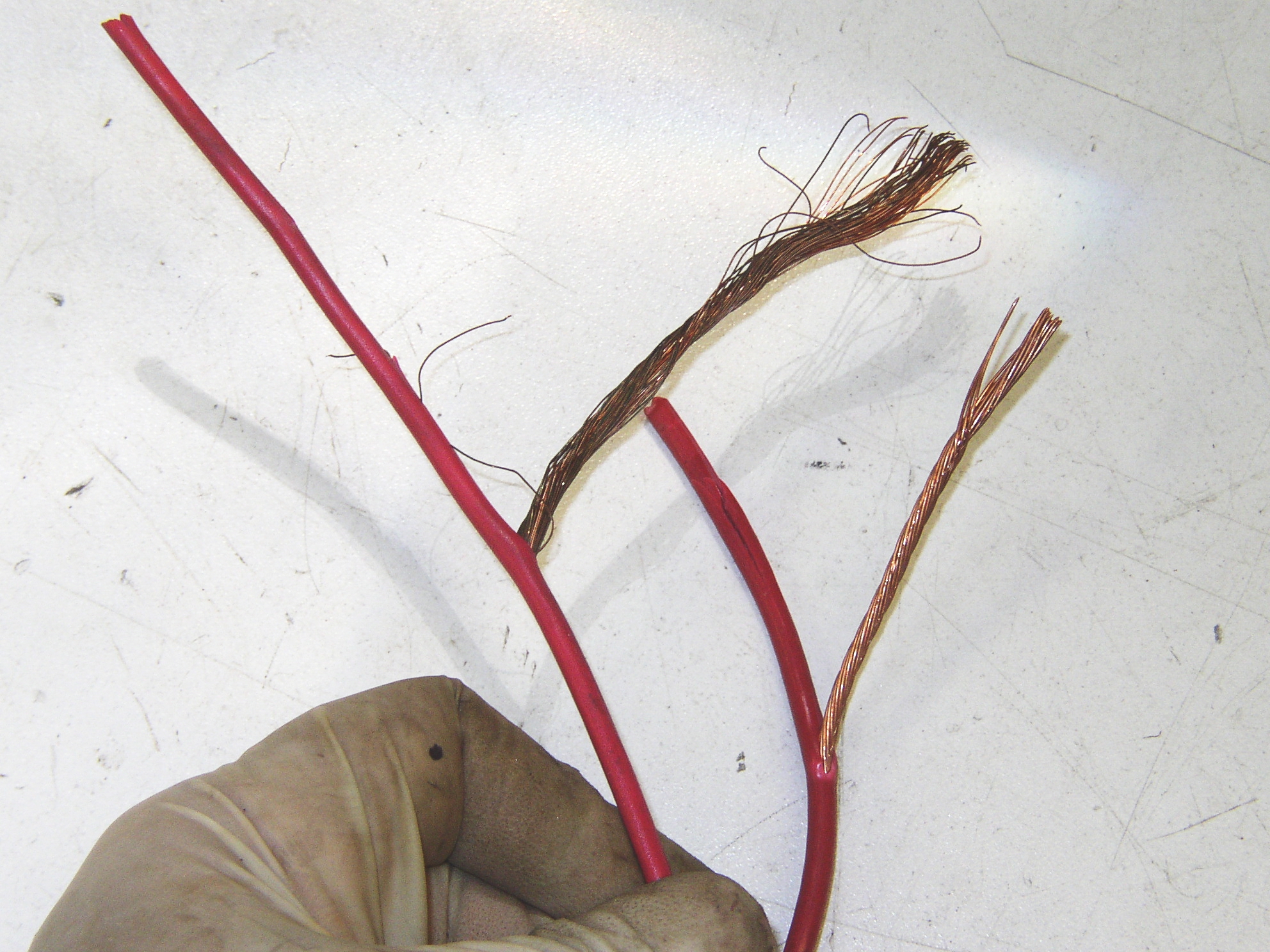 Out with the bad. Here's a really good reason to hang a harness on an old car: You can't see this, it's 5 feet from the rear of the bus in the main power feed heading up to the dashboard. The wire had moisture get into it and corrosion crawled 5+ feet (maybe much more) forward inside the insulation which would obviously cause all kinds of issues. The old wire is compared to what a new wire looks like when peeled open. Get organized. Tape up the loose ends of the new harness so it can be pulled through the tight spots. Tape the new harness to a household "fish tape" to be pulled through. I start in the middle of the bus pulling the tail end backward and the front end forward. Here I've already pulled the tail end back to the engine compartment. Then pull the front end forward into the valance area. You know you have the front-to-back at the correct location when the starter wires fit correctly. (The eyelet is cut off because this is where the 40A MegaFuse splices in). Once it's pulled through the front frame rail over the axle, it's fed by hand upward into the passenger compartment with a little brakeclean to make it slippery. Lock down the holding tabs.
