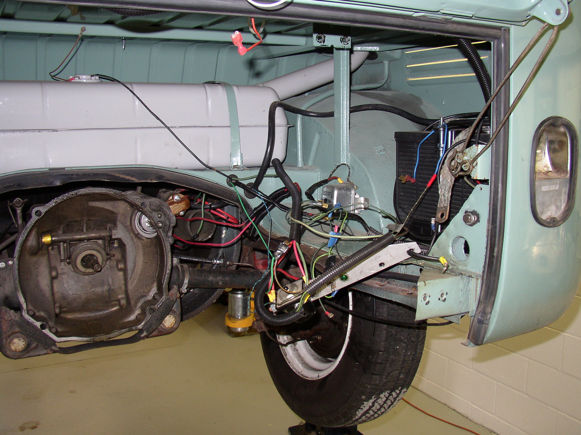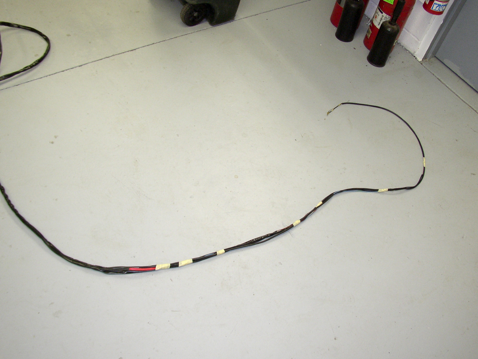 Out with the bad. Here's a really good reason to hang a harness on an old car: You can't see this, it's 5 feet from the rear of the bus in the main power feed heading up to the dashboard. The wire had moisture get into it and corrosion crawled 5+ feet (maybe much more) forward inside the insulation which would obviously cause all kinds of issues. The old wire is compared to what a new wire looks like when peeled open. Get organized. Tape up the loose ends of the new harness so it can be pulled through the tight spots. Tape the new harness to a household "fish tape" to be pulled through. I start in the middle of the bus pulling the tail end backward and the front end forward. Here I've already pulled the tail end back to the engine compartment. Then pull the front end forward into the valance area. You know you have the front-to-back at the correct location when the starter wires fit correctly. (The eyelet is cut off because this is where the 40A MegaFuse splices in). Once it's pulled through the front frame rail over the axle, it's fed by hand upward into the passenger compartment with a little brakeclean to make it slippery. Lock down the holding tabs.