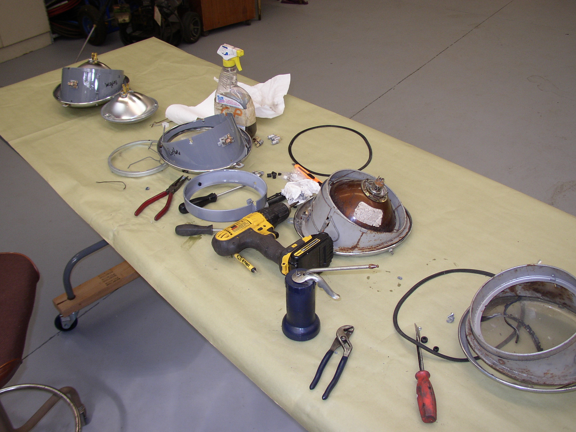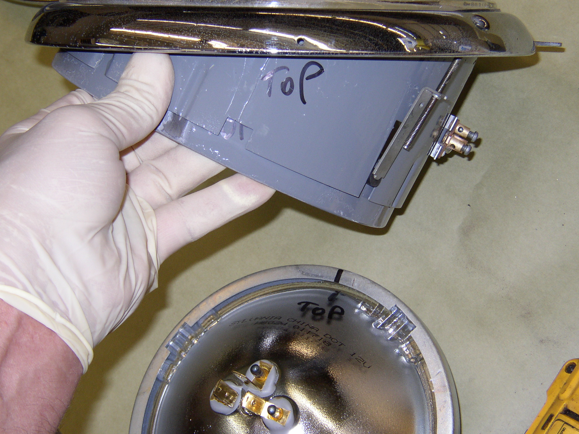 FNG wire wheeling, bead blasting, and painting parts. It's hard to find good help these days, the last FNG only lasted a couple of weeks. FNG assembling the headlight buckets. Pretty much all parts are dedicated left or right so make sure you keep them straight and mark them top and bottom to make it easier to assemble. Heat any grommets to make them more pliable to install. Meanwhile I was doing the speedo head, when I took it apart the colored gels fell out, which is pretty much normal. I bead blasted the can, buffed the chrome trim ring, cleaned things up and glued in new gels with weatherstrip adhesive. I had the FNG bead blast all of the sockets and put in new 12v bulbs. I always test them for about 30 seconds each to make sure the bulbs are good and everything is super. Here's a before and after picture. After installation with the power on.