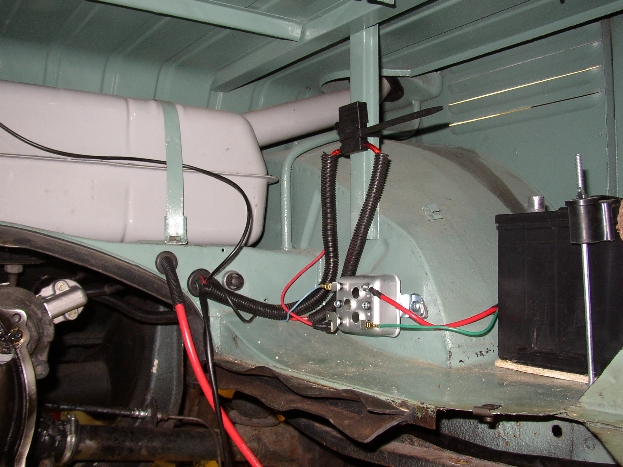 Here's the starter area detailed with Polyloom to protect the wiring. I've been epoxying a wire clamp to the tray so I have a place to put a ty-wrap, I don't like the harness laying on the heater box which is what happens after it warms up. You can't use a sheetmetal screw here as the fuel tank is just above it, ask me how I know that.