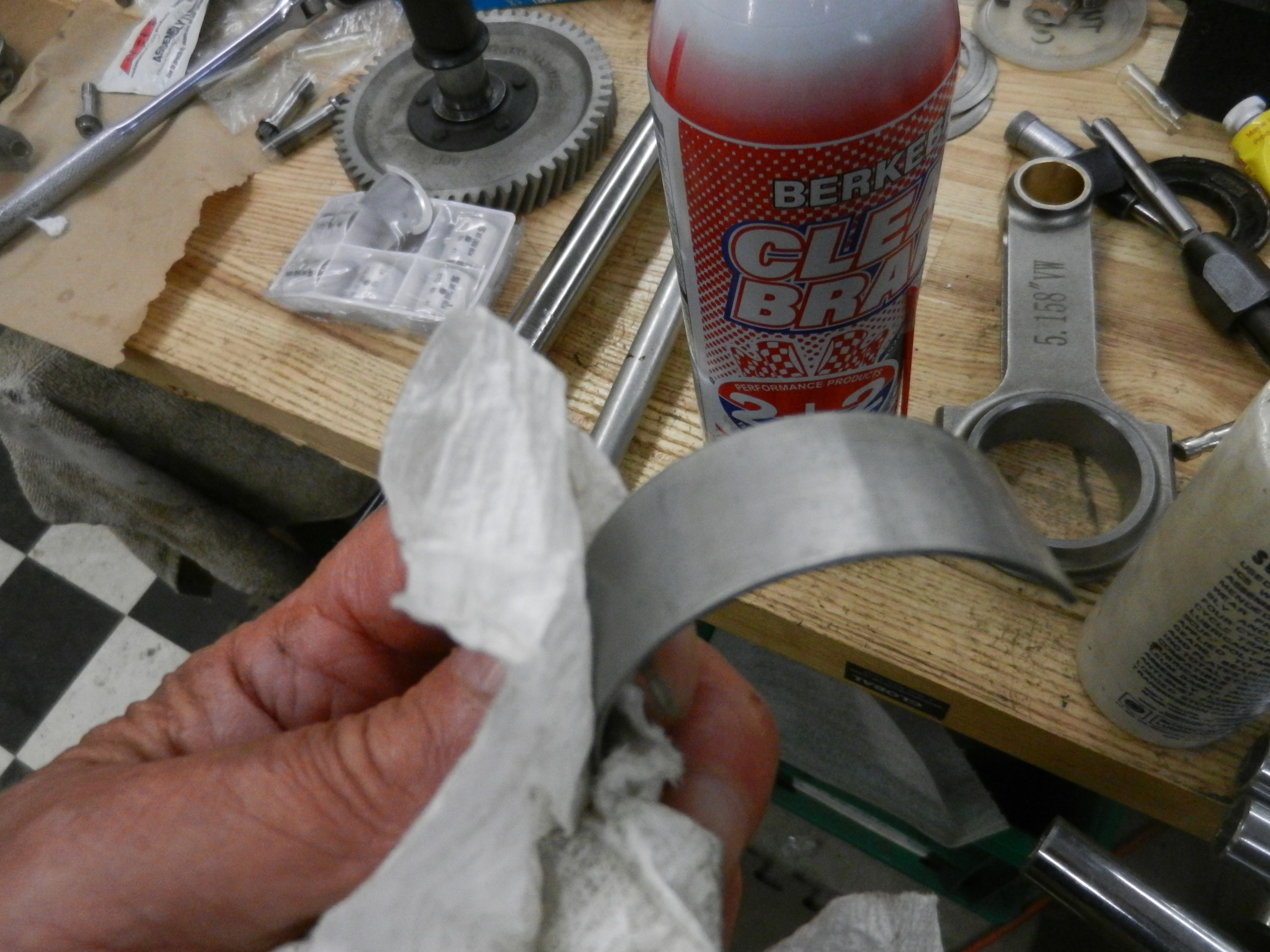 Now we are going to hang the rods for some measurements. First, wipe the bearings,rod big end and rod journal clean.