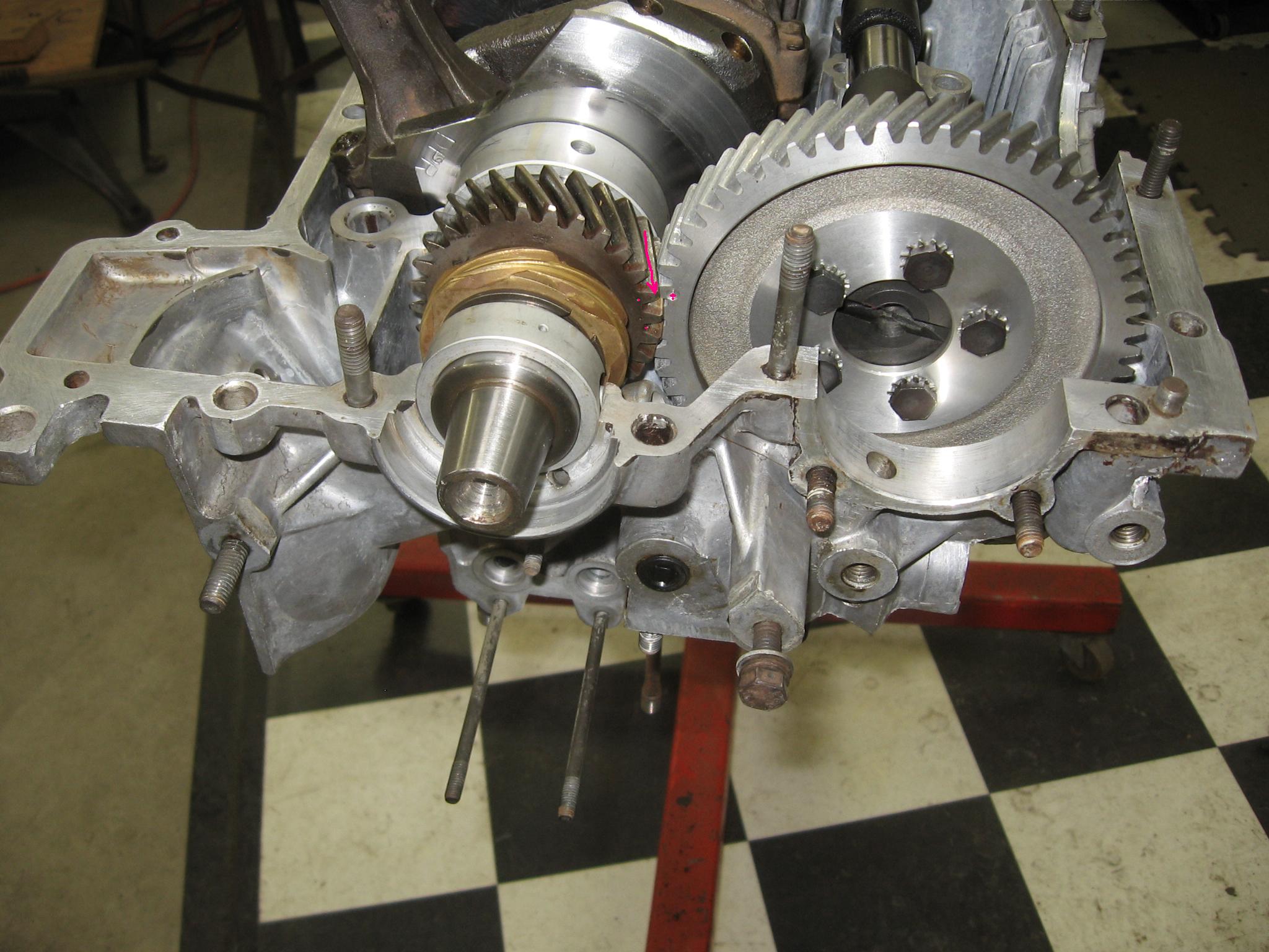 One more thing to check. The oil pump. Type 4 oil pumps are no longer available. They have 24mm gears. I won't waste any time explaining disassembly and inspection. Don't use it. It is between 37 and 47 years old and probably 100,000 plus miles on it. And there will be a clearance issue with the bolts on cam gear.