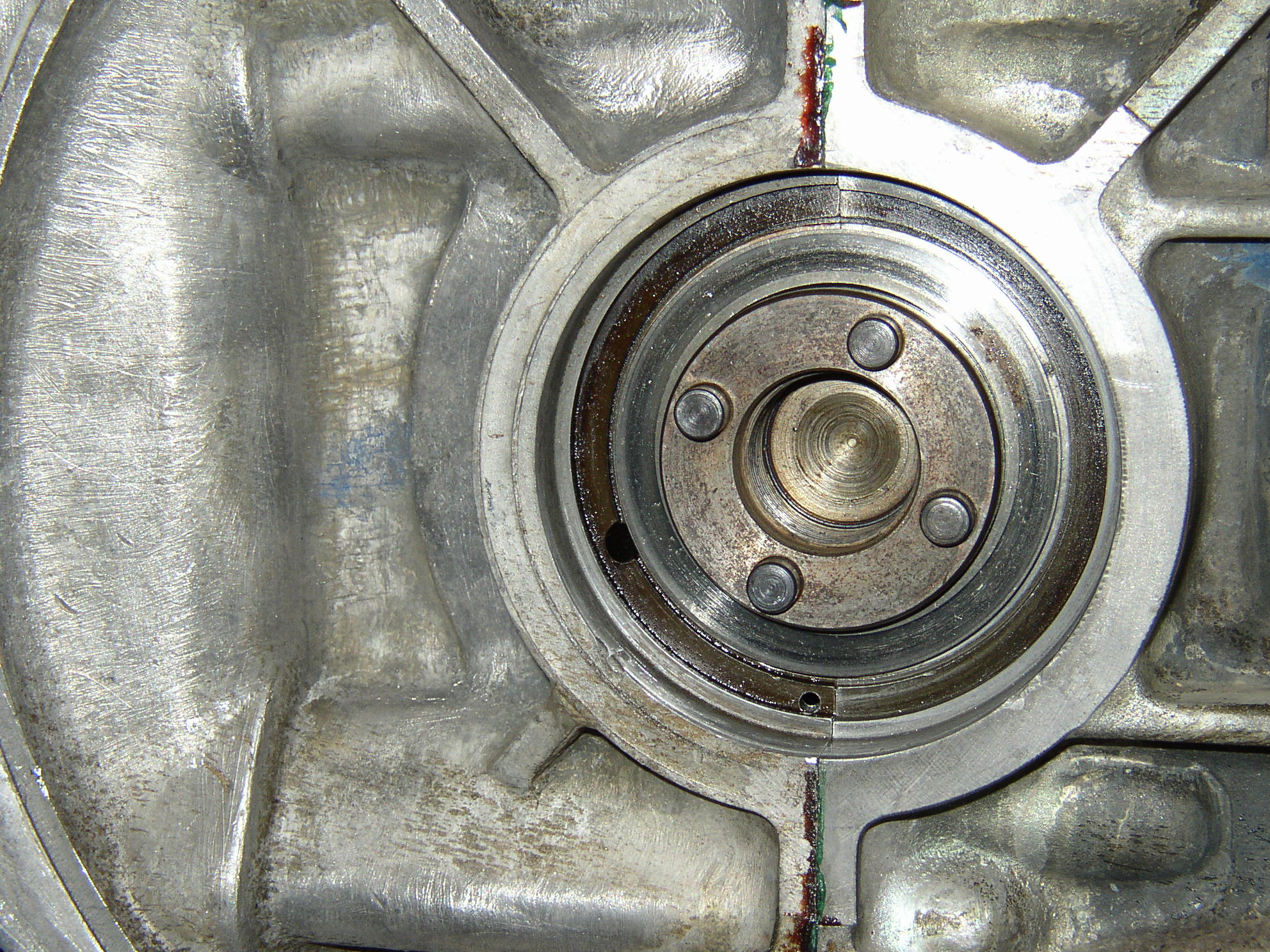 Might as well look at the clutch and stuff to find the disc wearing unevenly and the rear seal leaking. I cleaned up the back of the case and put in a new seal. I also bead blasted the flywheel to give the new clutch a nice surface to wear into.