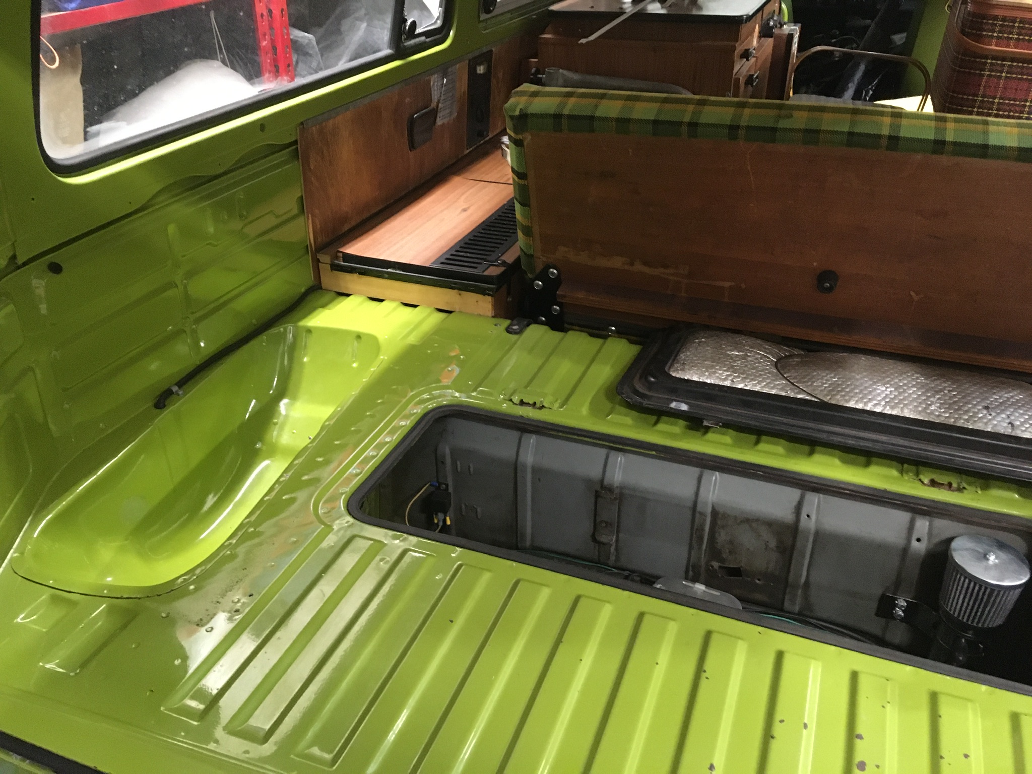 Finally got around to putting in new sliding rear windows. Rather had new windows put in. I was afraid there was some rust in the channels so found a body shop through the Cincinnati VW Club that was up to the task. I took out the rear cabinetry and took it over. Turns out there was rust in the left side rear and rear hatch. Right side was okay.