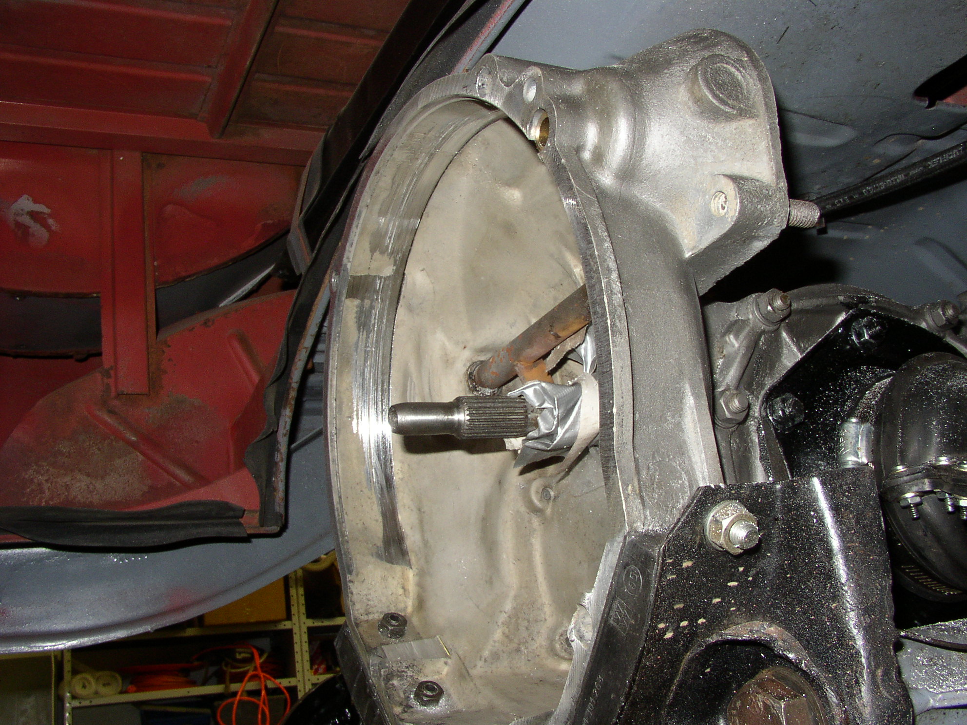 Time for something to laugh at. The trans I had built was an early 60's 6v, probably a small nut, and I put big nut axles on it but my 12v flywheel won't fit in a 6v bell. You know what comes next, the Hillbilly Bridgeport.